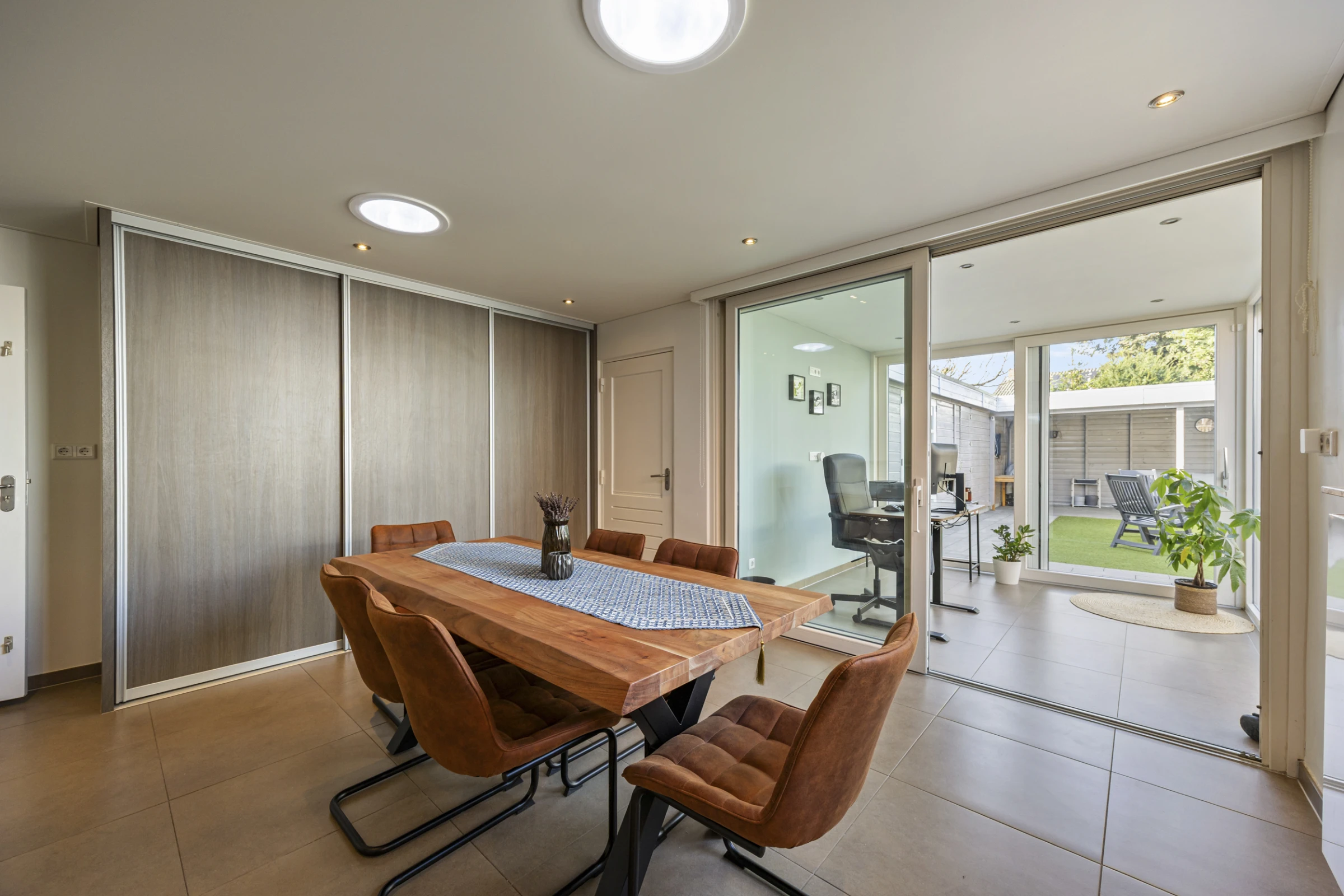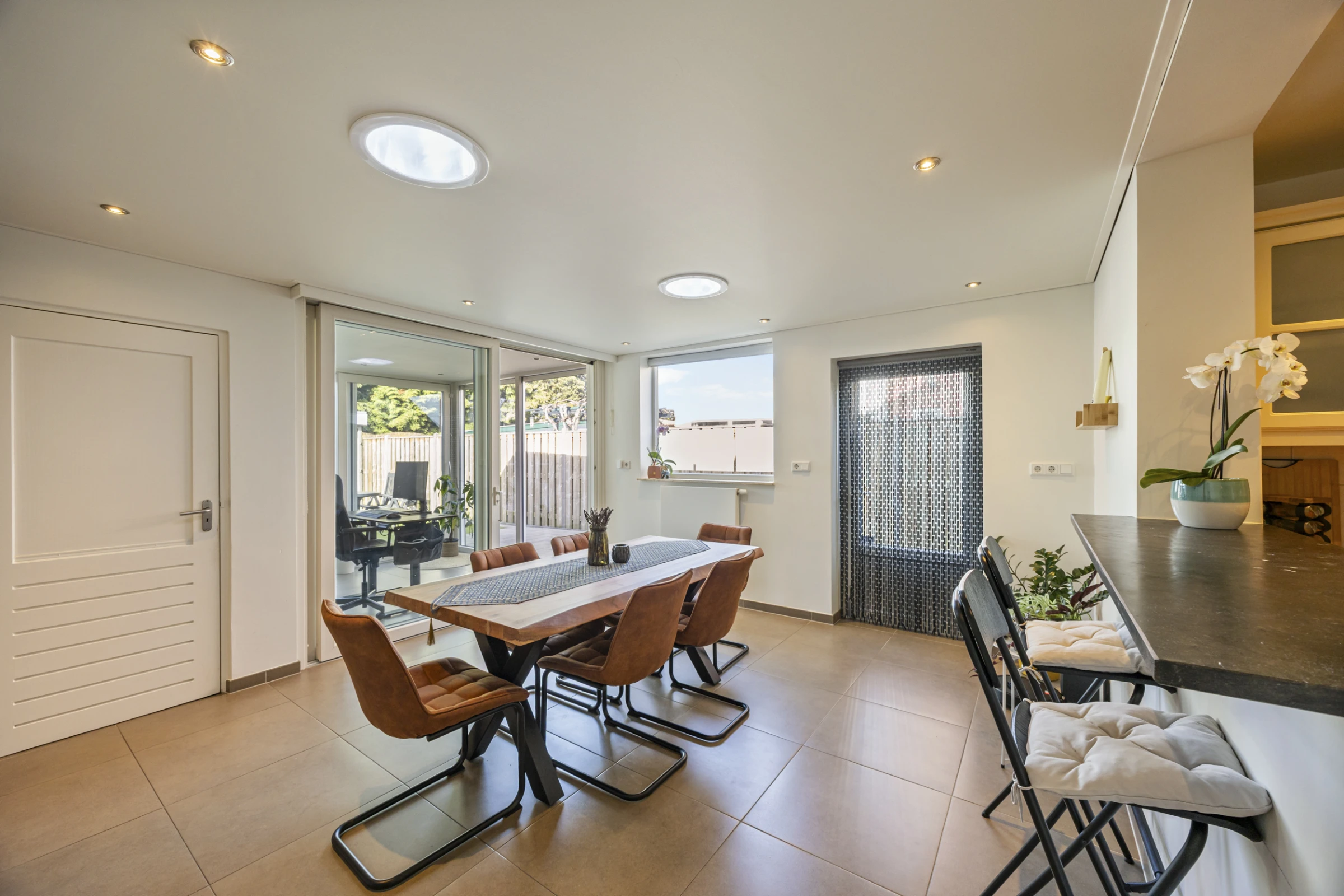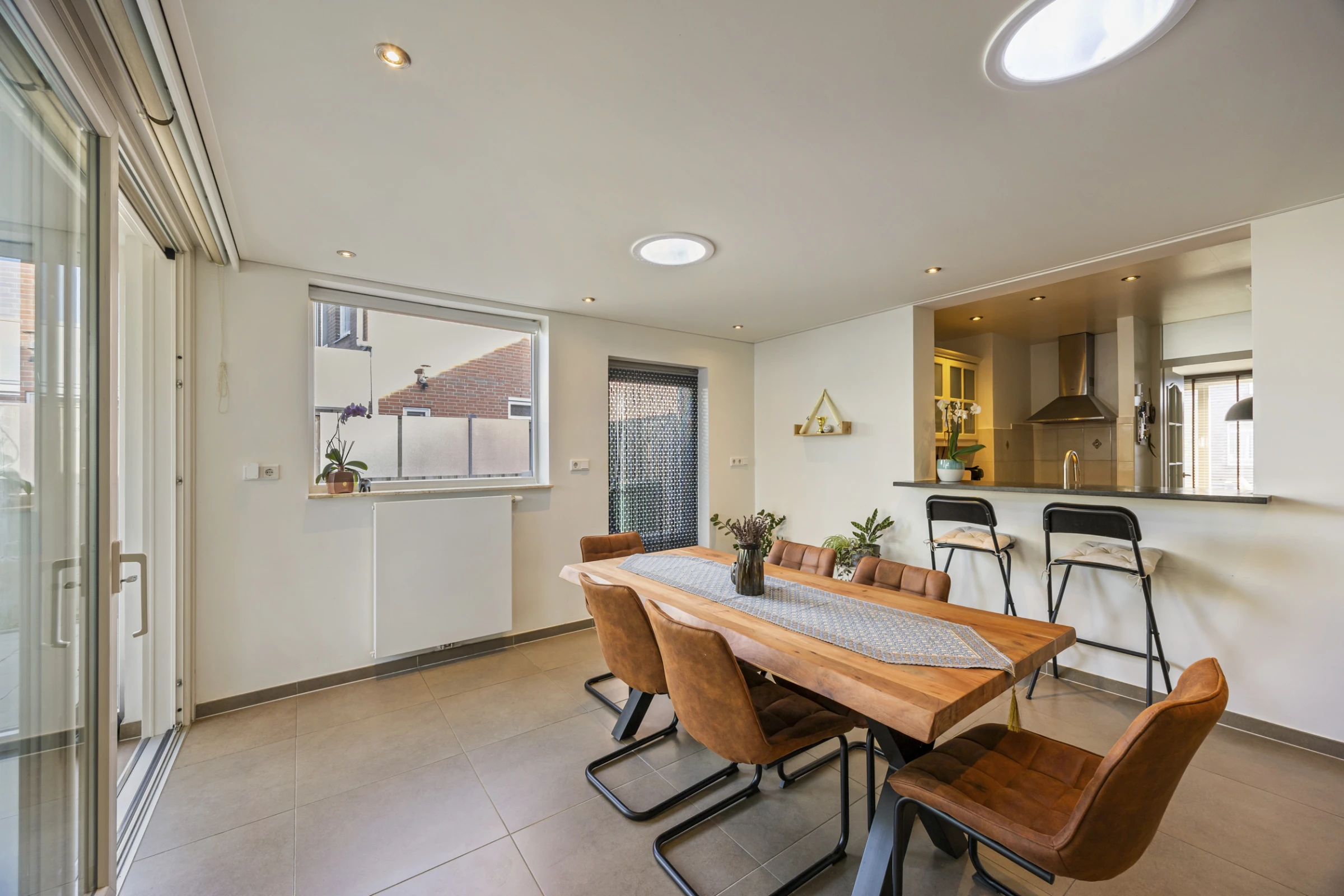 Entree in de hal met betegeld toilet met fonteintje, moderne meterkast en toegang tot de woonkamer. De woonkamer heeft een stijlvol niveau van afwerking, met onder andere een mooie tegelvloer. Ook is in de woonkamer een trapkast gelegen, waar de unit van de vloerverwarming is geplaatst. Vanuit de woonkamer kom je in de keuken. Deze keuken heeft een nette hoekopstand en beschikt als inbouwapparatuur over een koelkast en een vaatwasser. Voorst heeft de keuken een los RVS gasfornuis met oven. Vanuit de keuken is de eetkamer bereikbaar. Ook hier een keurig niveau van afwerking en aansluitend aan deze eetkamer heeft de woning nog een inpandige berging en tuinkamer. De tuinkamer is geheel voorzien van kunststof kozijnen, een schuifpui en heeft rolluiken. De inpandige berging bevat de aansluitpunten voor het witgoed en de begane grond beschikt grotendeels over vloerverwarming en rolluiken.