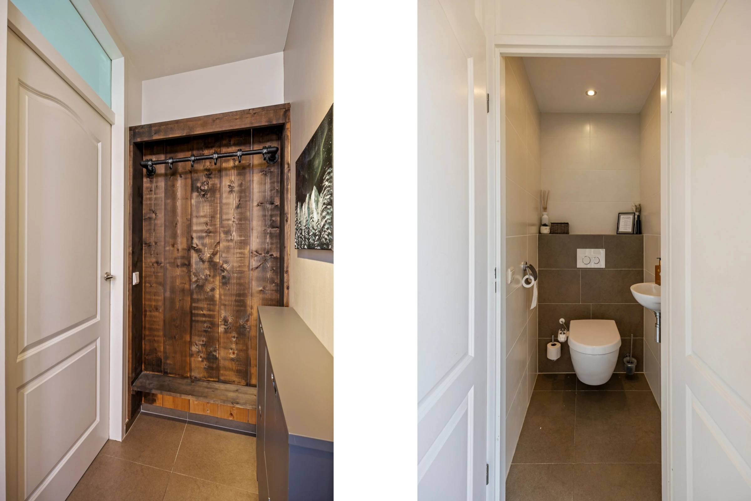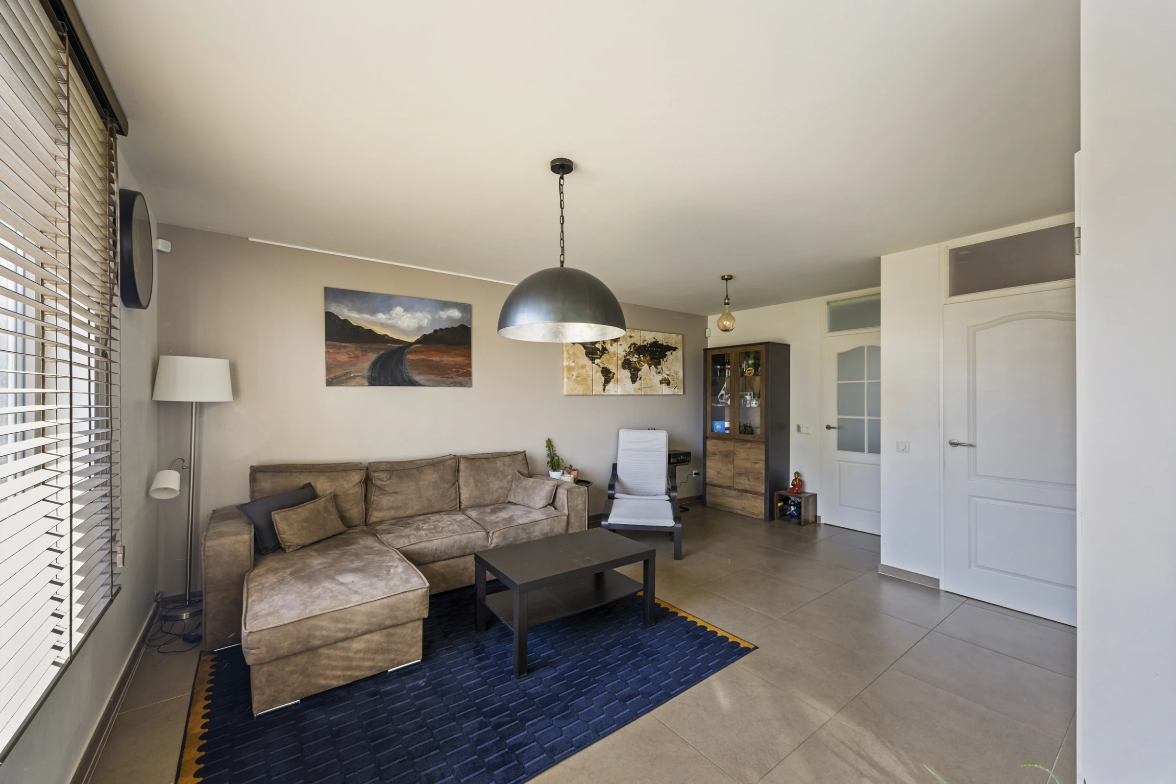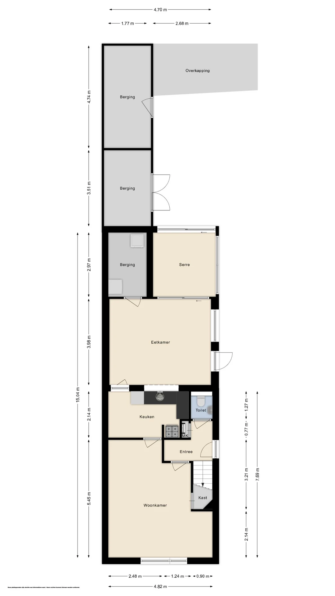Entree in de hal met betegeld toilet met fonteintje, moderne meterkast en toegang tot de woonkamer. De woonkamer heeft een stijlvol niveau van afwerking, met onder andere een mooie tegelvloer. Ook is in de woonkamer een trapkast gelegen, waar de unit van de vloerverwarming is geplaatst. Vanuit de woonkamer kom je in de keuken. Deze keuken heeft een nette hoekopstand en beschikt als inbouwapparatuur over een koelkast en een vaatwasser. Voorst heeft de keuken een los RVS gasfornuis met oven. Vanuit de keuken is de eetkamer bereikbaar. Ook hier een keurig niveau van afwerking en aansluitend aan deze eetkamer heeft de woning nog een inpandige berging en tuinkamer. De tuinkamer is geheel voorzien van kunststof kozijnen, een schuifpui en heeft rolluiken. De inpandige berging bevat de aansluitpunten voor het witgoed en de begane grond beschikt grotendeels over vloerverwarming en rolluiken.