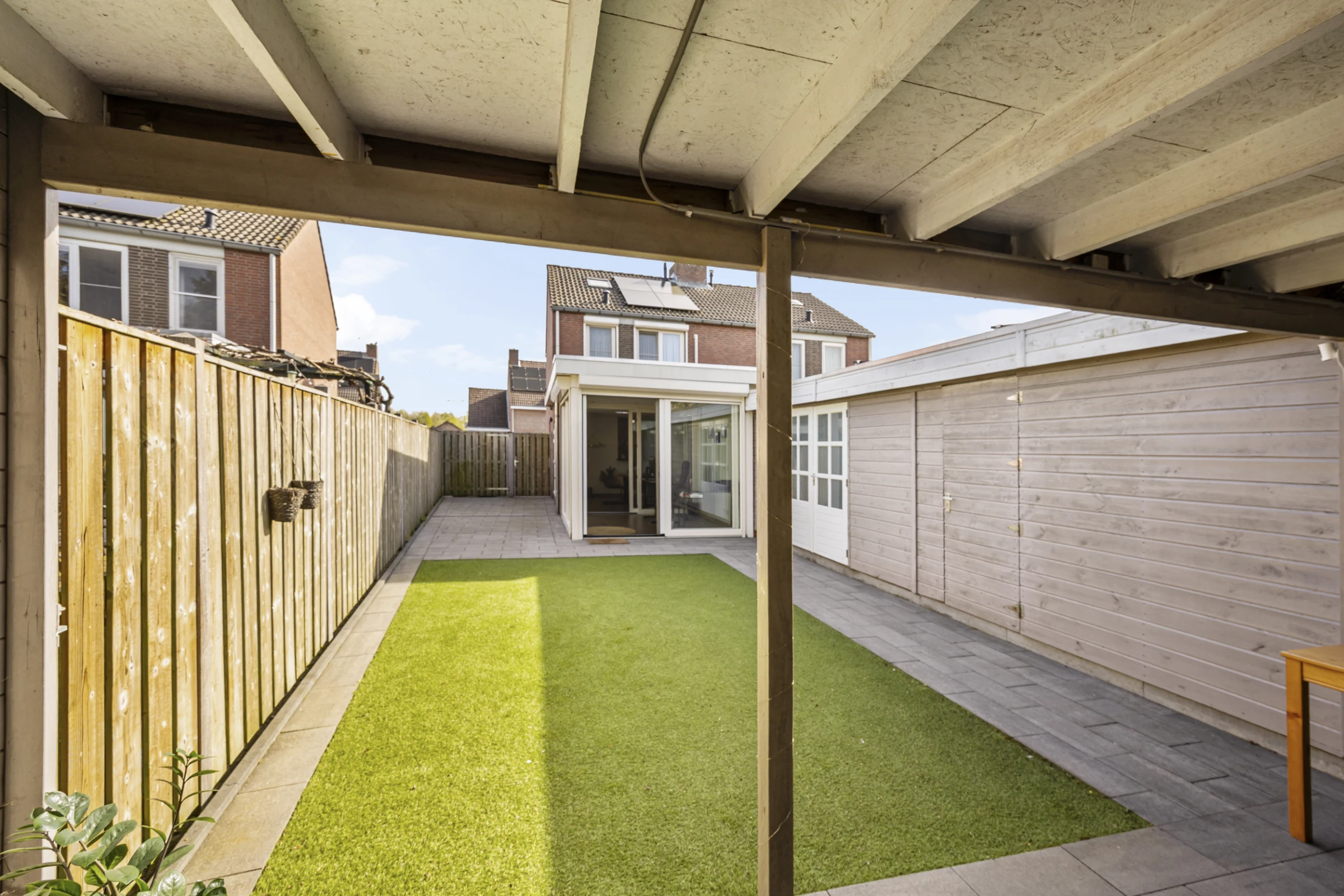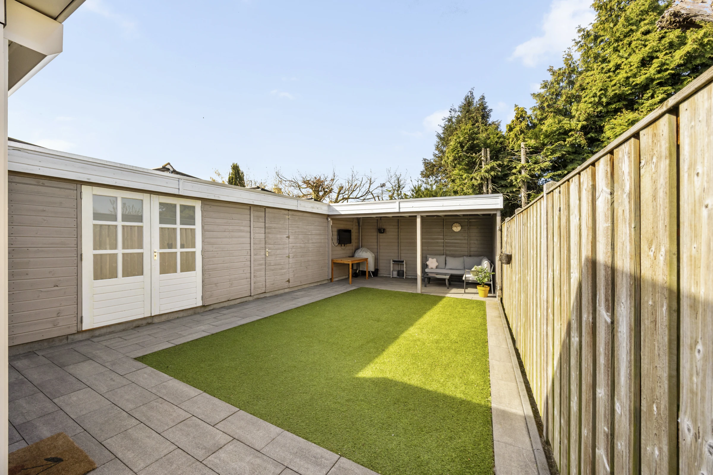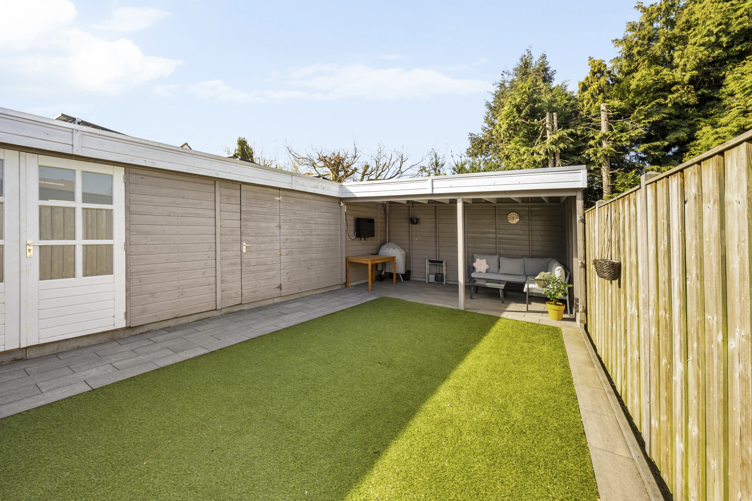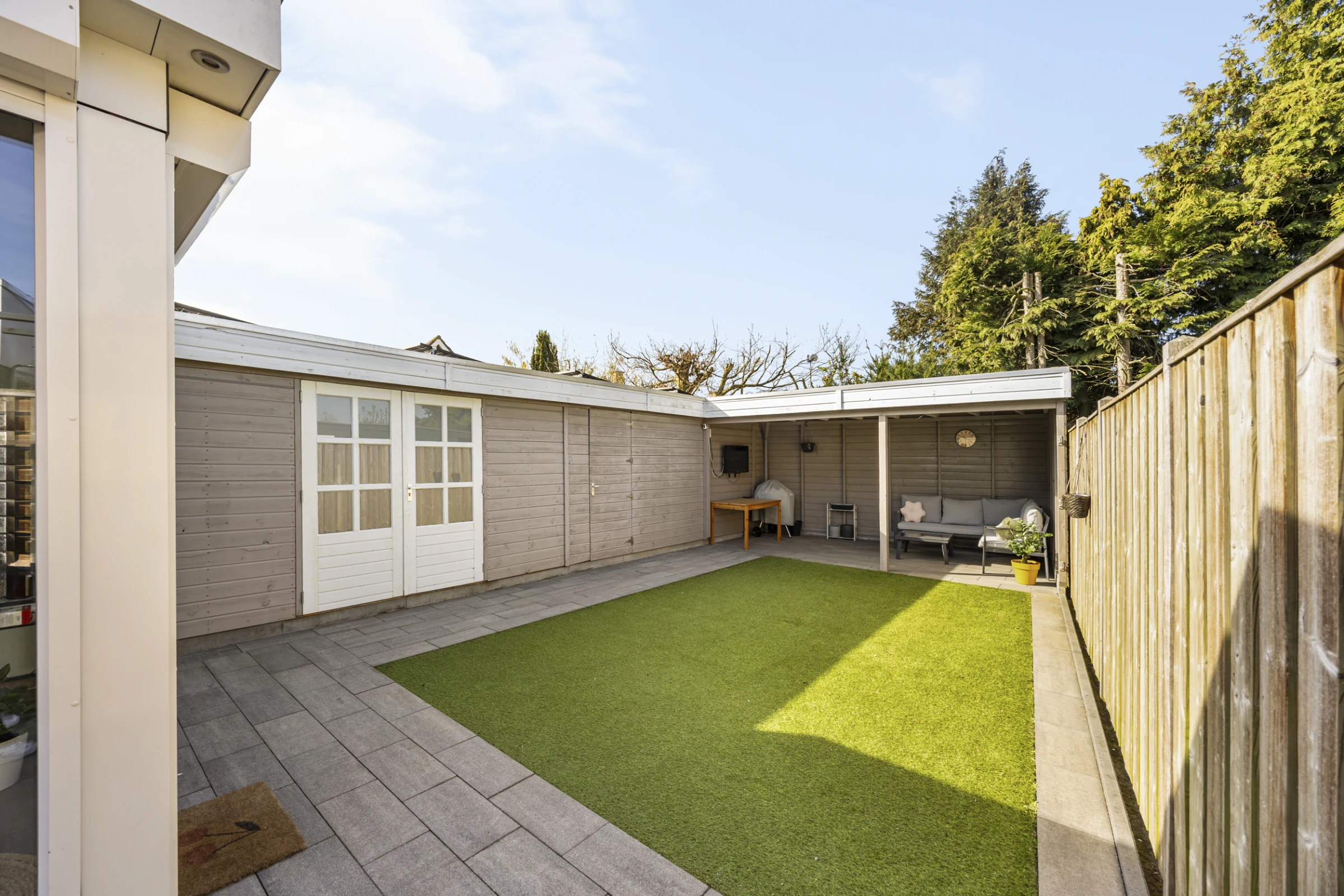 Deze fraaie 2-onder-1-kap-woning heeft ook nog eens een onderhoudsvriendelijke achtertuin, met 2 houten bergingen en een luxe terrasoverkapping. De tuin is gelegen op het Zuid Westen en heeft een gazon van kunstgras. De tuin is bereikbaar via een eigen achterom en heeft aan de voorkant nog een riante oprit, waar je makkelijk 2 auto’s kunt parkeren.