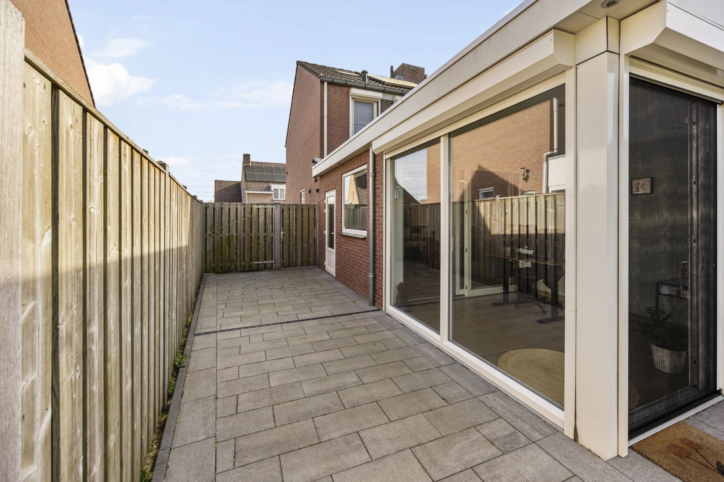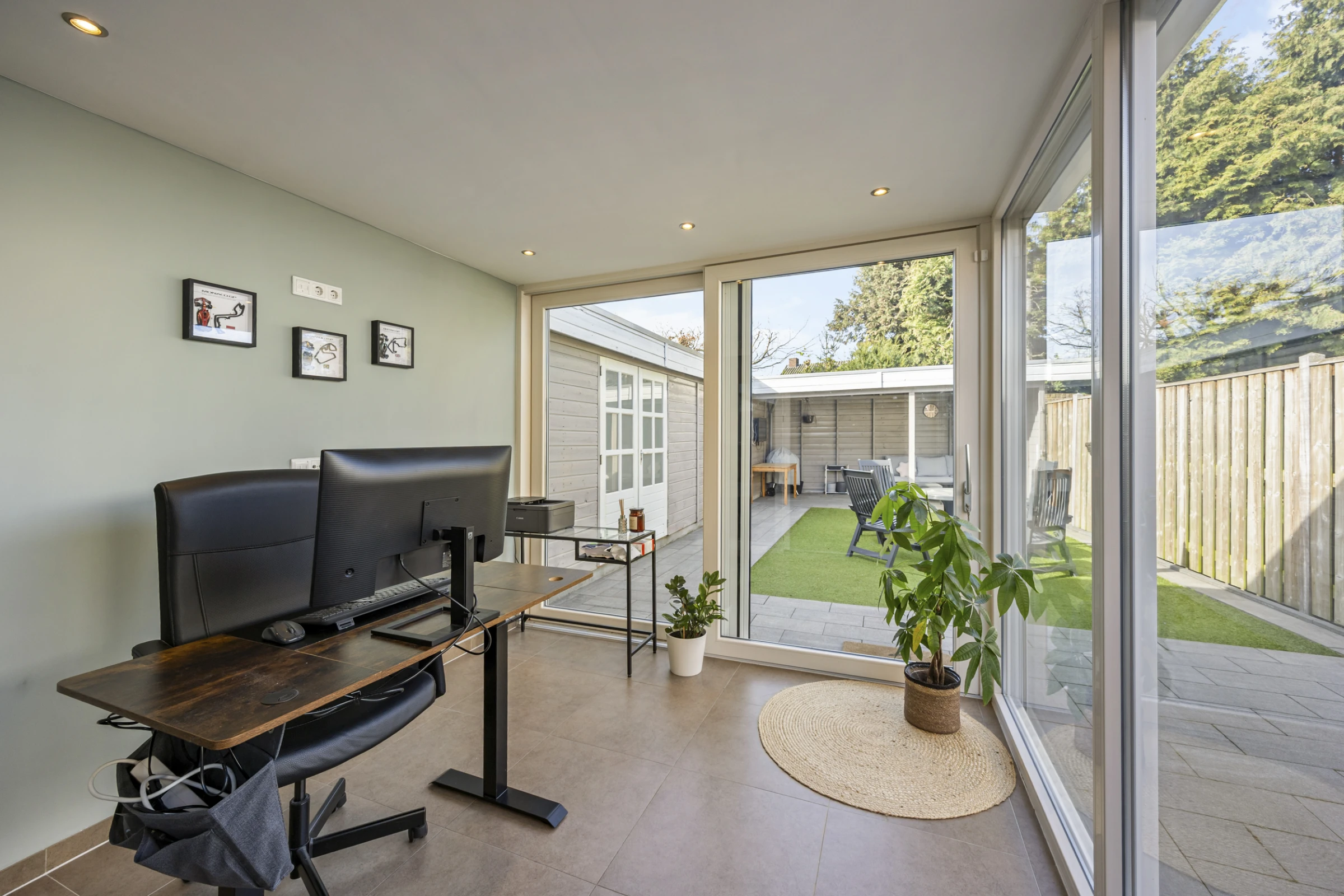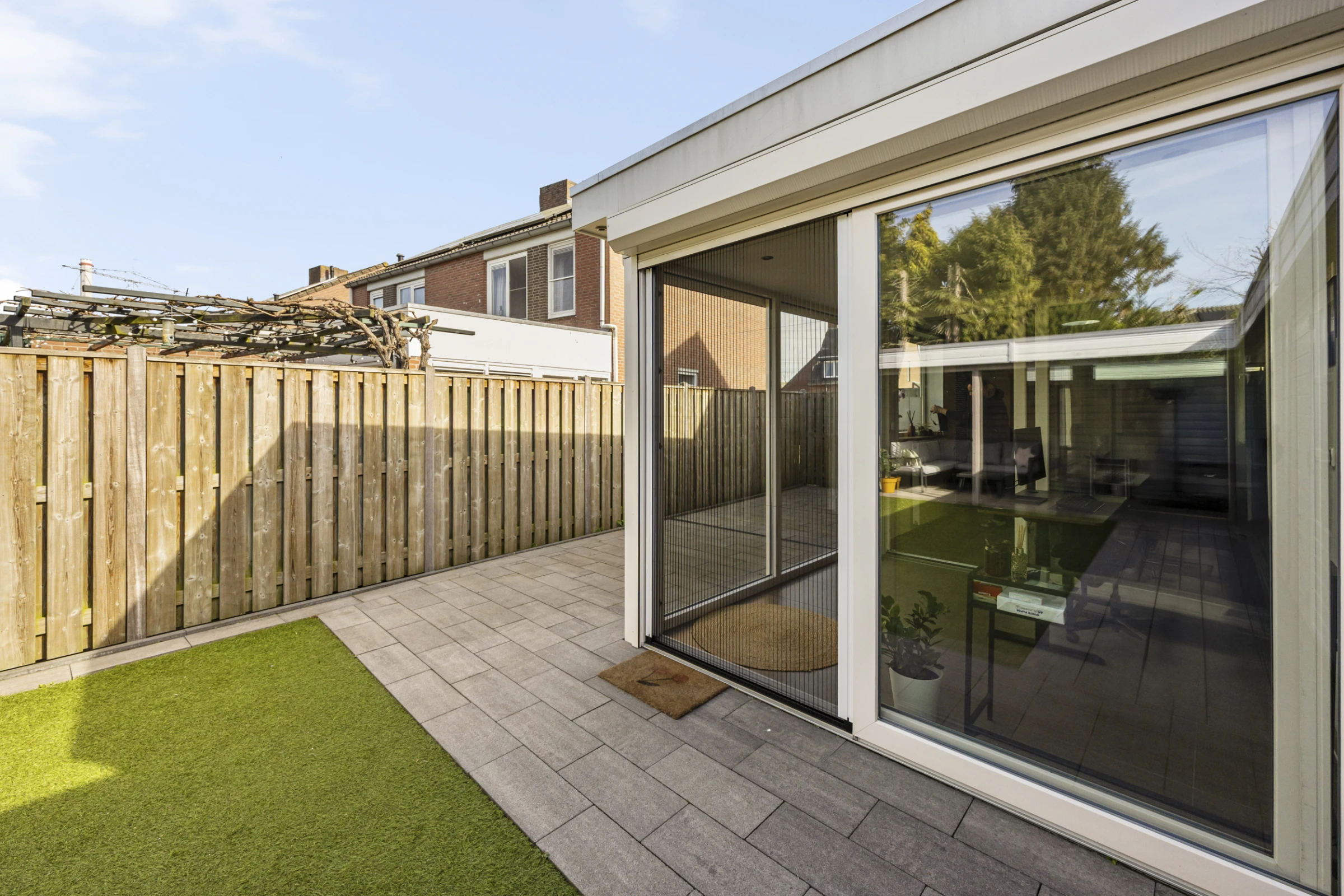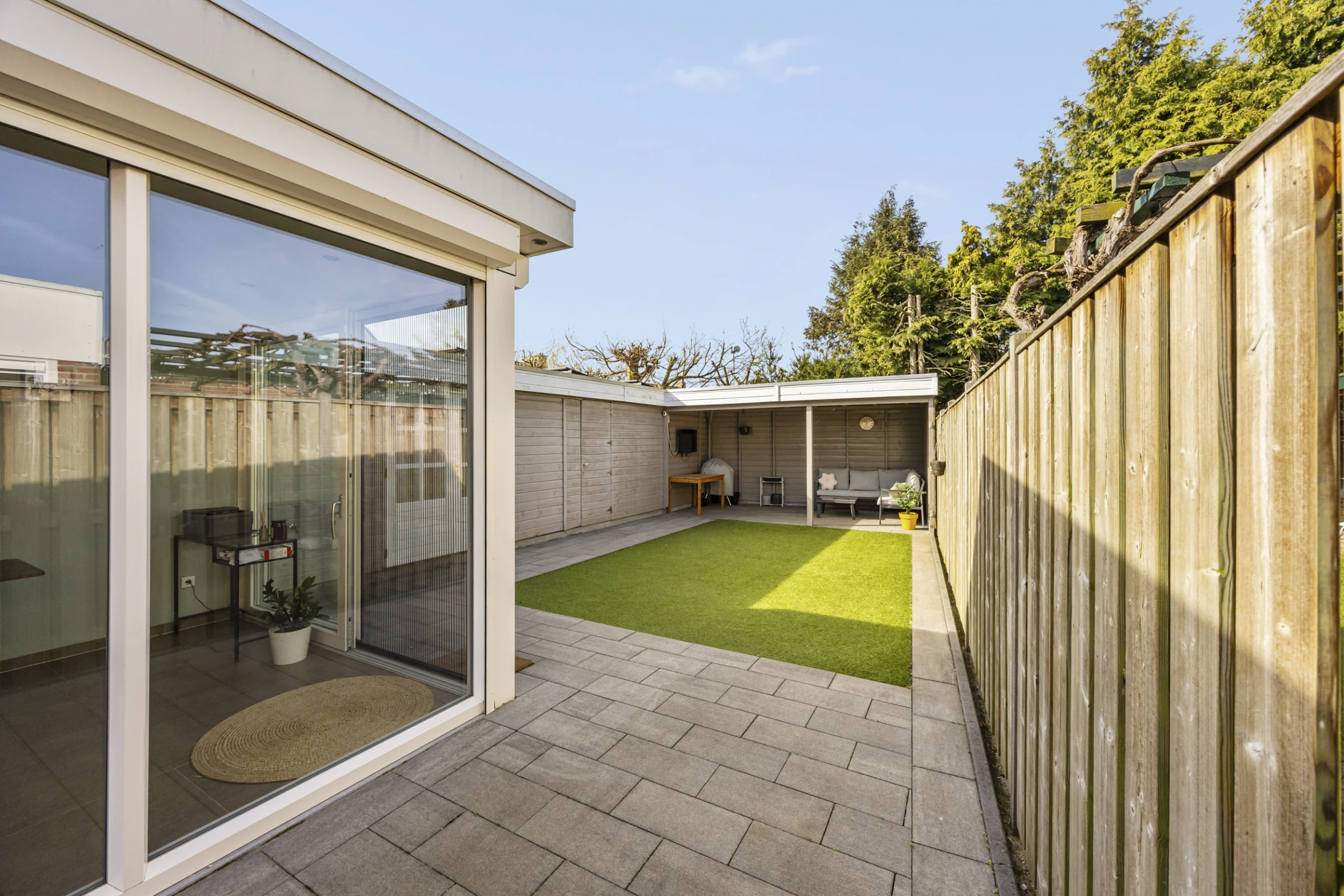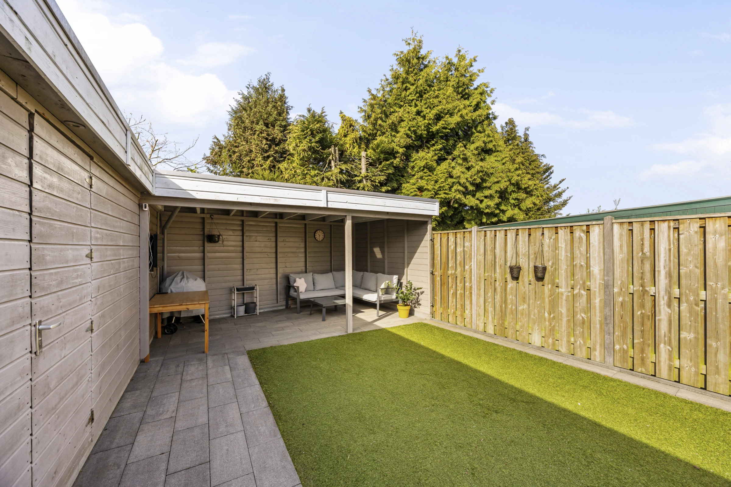 Deze fraaie 2-onder-1-kap-woning heeft ook nog eens een onderhoudsvriendelijke achtertuin, met 2 houten bergingen en een luxe terrasoverkapping. De tuin is gelegen op het Zuid Westen en heeft een gazon van kunstgras. De tuin is bereikbaar via een eigen achterom en heeft aan de voorkant nog een riante oprit, waar je makkelijk 2 auto’s kunt parkeren.