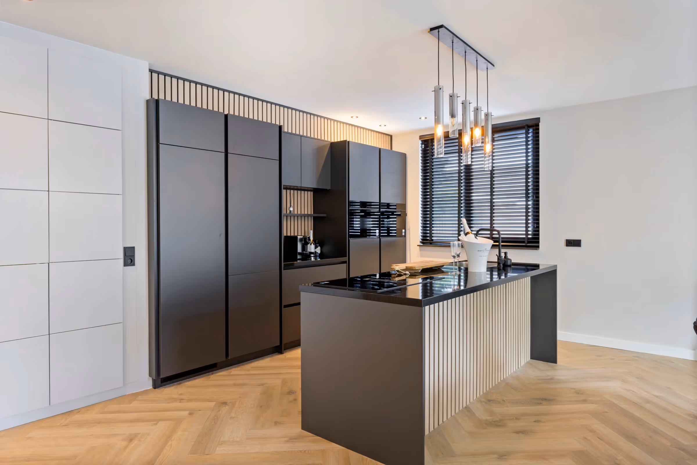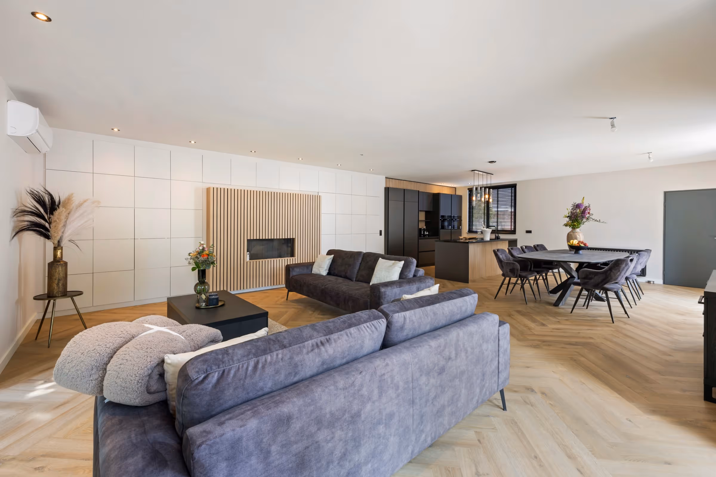 Via de hal (met meterkast en modern gastentoilet) kom je in de diverse kamers van dit fraaie woonhuis. De lichte en ruime woonkamer met leefkeuken ligt aan de achterzijde en heeft door de grote raampartijen een mooi tuincontact. Deze woonkamer en leefkeuken zijn voorzien van een hoogwaardige PVC vloer. Ook heeft de woonkamer een gashaard, airco en een luxe kastenwand, geheel op maat gemaakt en met veel extra bergruimte. De hagelnieuwe en luxe woonkeuken beschikt over een groot kook- en spoeleiland en een matzwarte kleurstelling. Qua inbouwapparatuur is eveneens voor kwaliteit gekozen; een inductie kookplaat met afzuiging, stoomoven, combi oven (beide van Siemens), grote koelkast en vaatwasser. Kortom, alles wat je nodig hebt en helemaal ongebruikt.