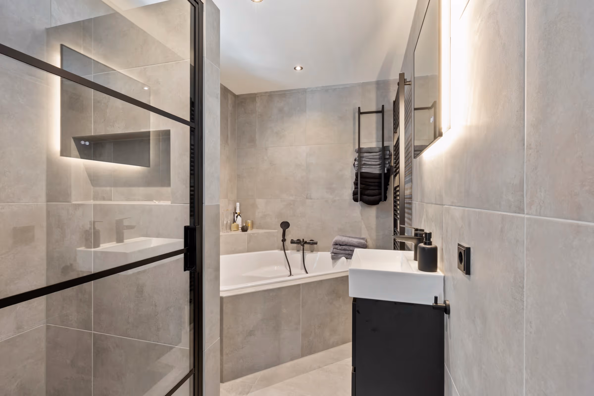 De badkamer op de begane grond is eveneens splinternieuw en dateert uit 2025. In de badkamer zijn een ligbad, inloopdouche, designradiator en groot wastafelmeubel aanwezig.