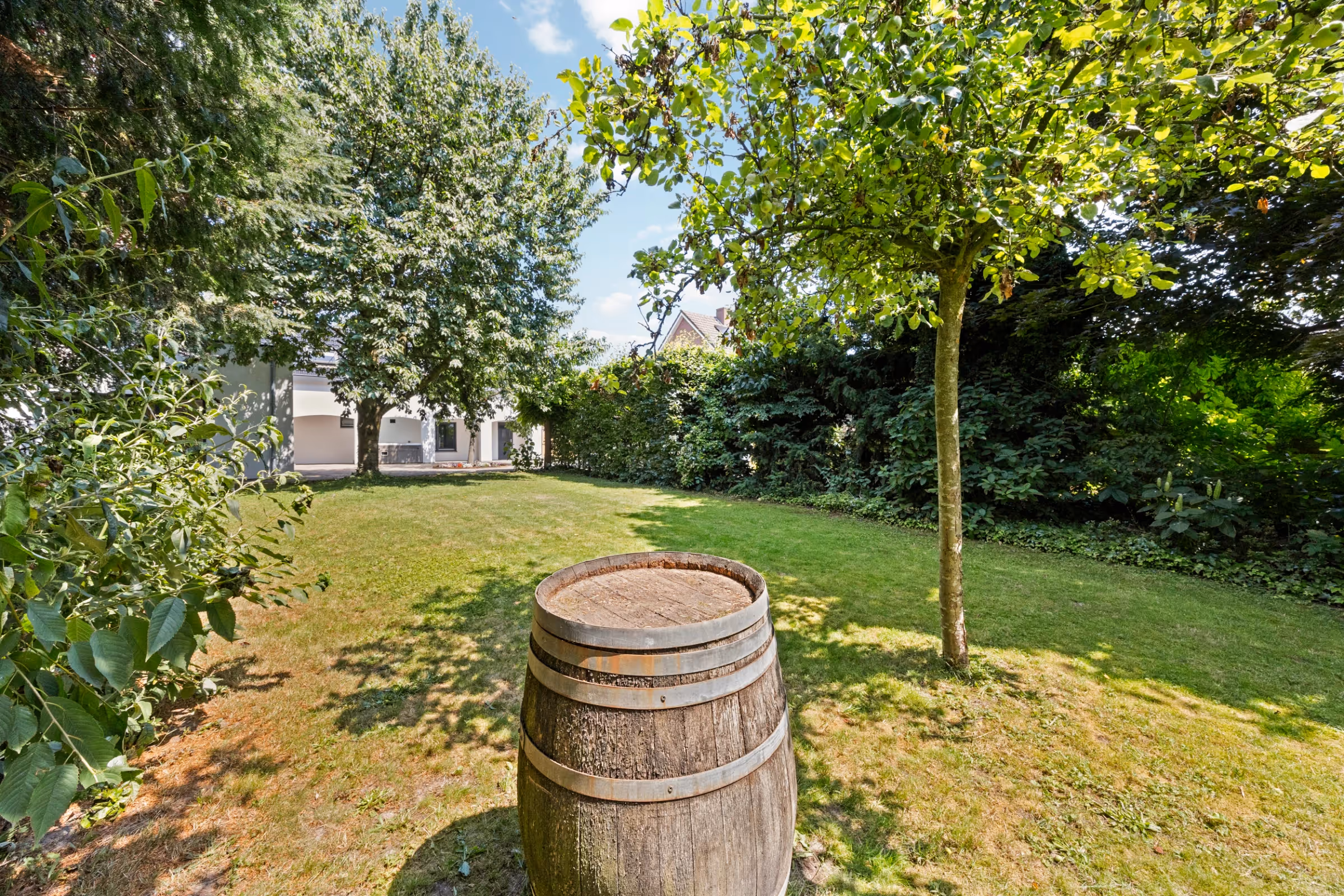 De tuin van dit luxe, vrijstaande woonhuis is ook een heerlijke plek. Hier geniet je van alle privacy, rust en een prima mix van groen en een groot terras. De ligging op het Zuid Westen, zorgt ervoor dat de tuin ook lekker zonnig is en je hebt een riante veranda, over de gehele breedte van de woning. De tuin is verder voorzien van een flink gazon en diverse bomen. Verder ligt hier een vrijstaande garage, welke net als de woning, voorzien is van luxe, wit gevel stucwerk. Tenslotte ligt achterin de tuin nog een houten tuinhuis.