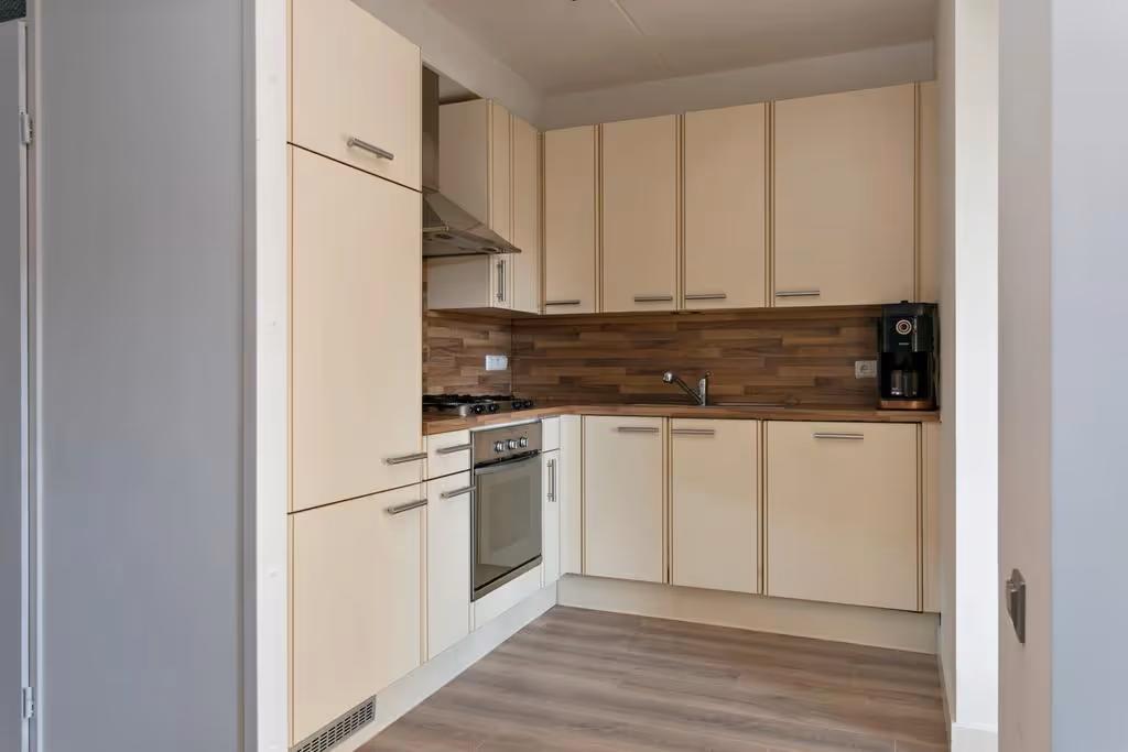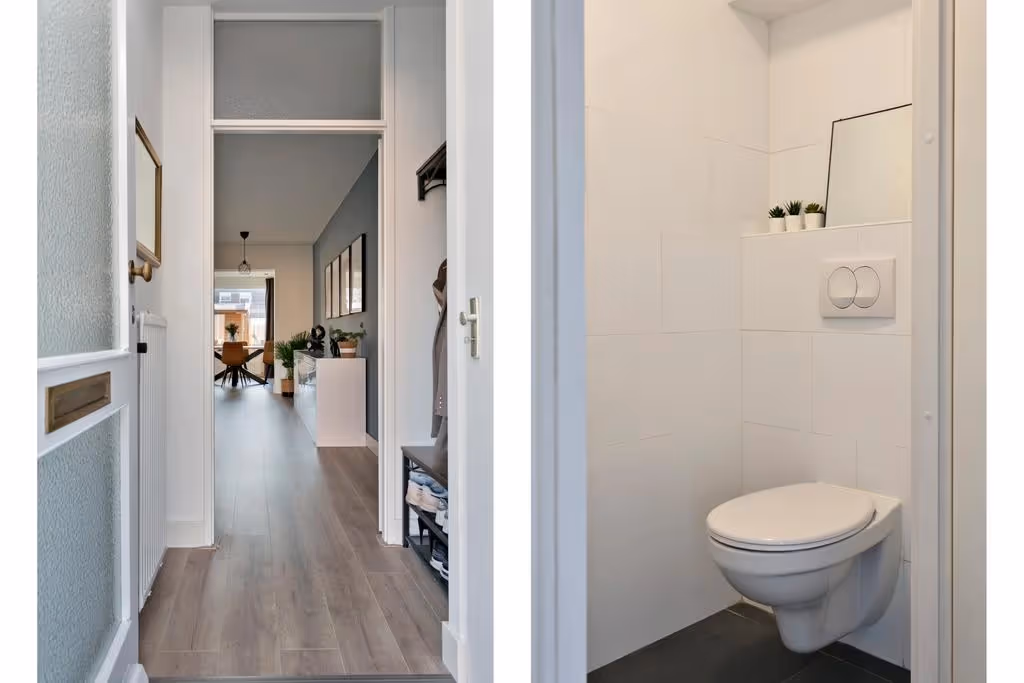 Entree in de ontvangsthal, met toegang naar woonkamer en meterkast. Deze woonkamer heeft een keurig niveau van afwerking en een mooie laminaatvloer. Aan de achterzijde is deze woonkamer uitgebreid met een aanbouw, waardoor je extra leefruimte hebt en de berging inpandig is geworden. De halfopen keuken heeft een hoekopstelling en de volgende inbouwapparatuur: koelkast, RVS wasemkap, 4-pits gasfornuis, oven en vaatwasser. Verder ligt op de begane grond de inpandige berging, met flink wat extra opbergruimte. Tenslotte zijn via een tussenhal de trapgang naar de 1e verdieping en het toilet gelegen.