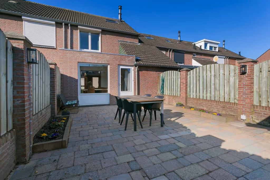 Deze fijne woning heeft ook een heerlijke tuin, welke onderhoudsvriendelijk is aangelegd. Deze tuin ligt op het Oosten en is geheel voorzien van sierbestrating, heeft enkele bordessen voor plantjes en een eigen achterom middels een poortje. Tenslotte ligt in de tuin een houten tuinhuis met overkapping, een heerlijk zitplekje in het voorjaar en de zomer.