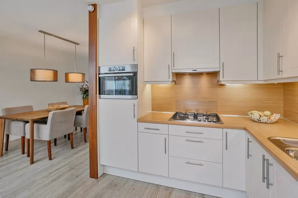 Entree in de ontvangsthal, met toegang naar woonkamer, toilet met fonteintje en meterkast. Deze L-vormige woonkamer heeft een keurig niveau van afwerking en een mooie pvc vloer. Aan de achterzijde is de woonkamer uitgebreid met een serre, waardoor je extra leefruimte hebt en de garage inpandig is geworden. De halfopen keuken heeft een hoekopstelling en de volgende inbouwapparatuur: koelkast, wasemkap, 4-pits gasfornuis, combi oven en vaatwasser. Verder ligt op de begane grond de inpandige garage, met elektrische sectionaalpoort.