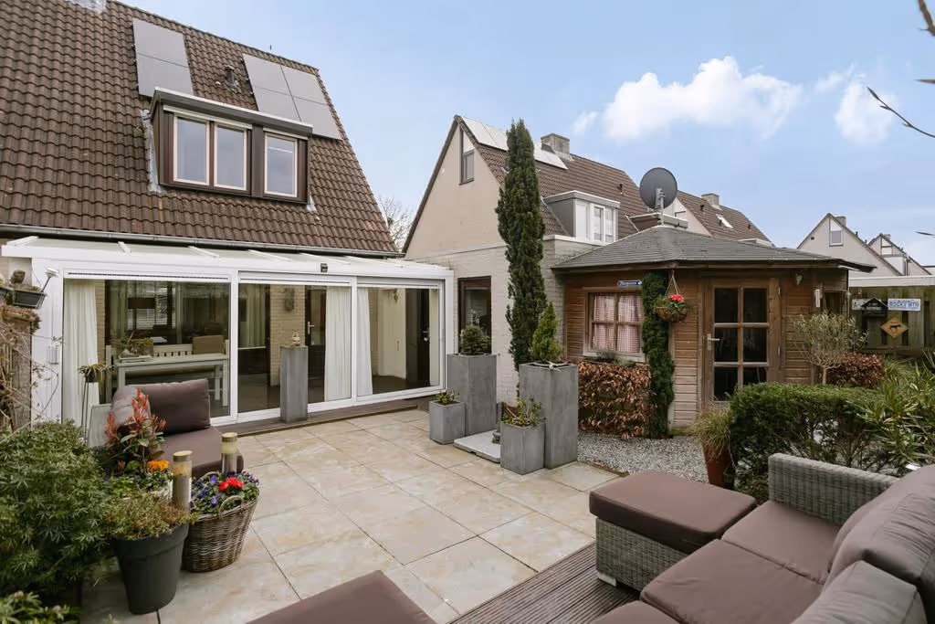 Deze fijne woning heeft ook een heerlijke tuin, welke onderhoudsvriendelijk is aangelegd, met diverse zithoekjes. Deze tuin ligt op het Westen en is grotendeels voorzien van een riant terras en heeft enkele bordessen voor beplanting en wat bomen. Tenslotte liggen in de tuin een houten en een aangebouwd stenen tuinberging met veel extra bergruimte of om als gezellig zitje te gebruiken.