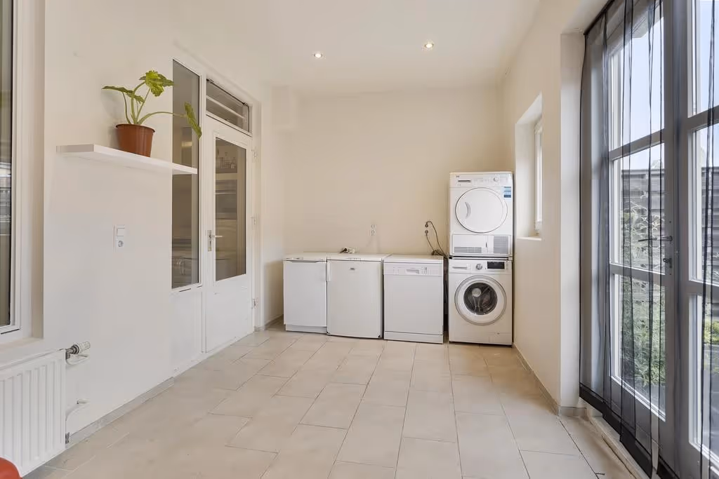 Aan de achterzijde is deze woonkamer uitgebreid met een aanbouw, waardoor je extra leefruimte hebt. Hier bevinden zich ook de aansluitpunten voor de wasmachine en deze tuinkamer is momenteel ingericht als speelkamer voor de kinderen. Uiteraard kan deze fijn kamer ook prima dienst doen als eetkamer of thuiswerkplek.