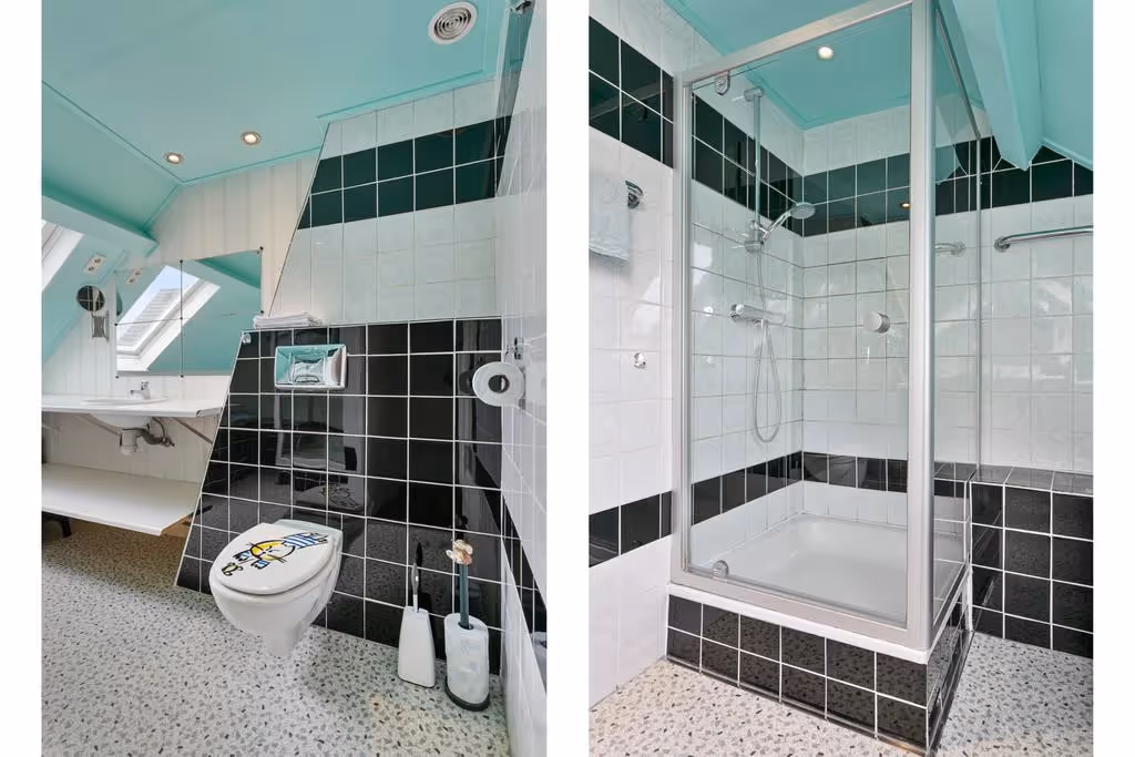 Via de overloop zijn (in de huidige indeling) 2 slaapkamers en een nette, lichte badkamer toegankelijk. Deze badkamer beschikt over een wastafelmeubel, ligbad, douchecabine en 2e toilet. De beide slaapkamers zijn ruim van opzet. Voorheen waren dit er 3 en dit is eenvoudig weer terug te brengen, als je wilt. De slaapkamers hebben dakkapellen voorzien van kunststof kozijnen, dubbele beglazing en rolluiken. Tenslotte is op deze verdieping een bergkast gelegen met aansluitpunten voor de wasmachine.