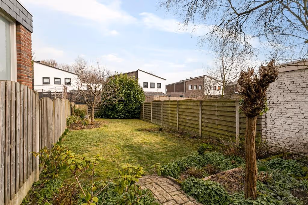 De achtertuin van dit huis is zo'n 30 meter diep en een fijn plekje om te vertoeven. Direct achter de woning ligt het terras. Aan de woning zit een stenen berging. De tuin ligt op het oosten en door de diepte heb je altijd wel ergens een plekje in de zon. Tenslotte bevat de tuin een kleine siervijver, een flink gazon, beplanting en 2 bomen.