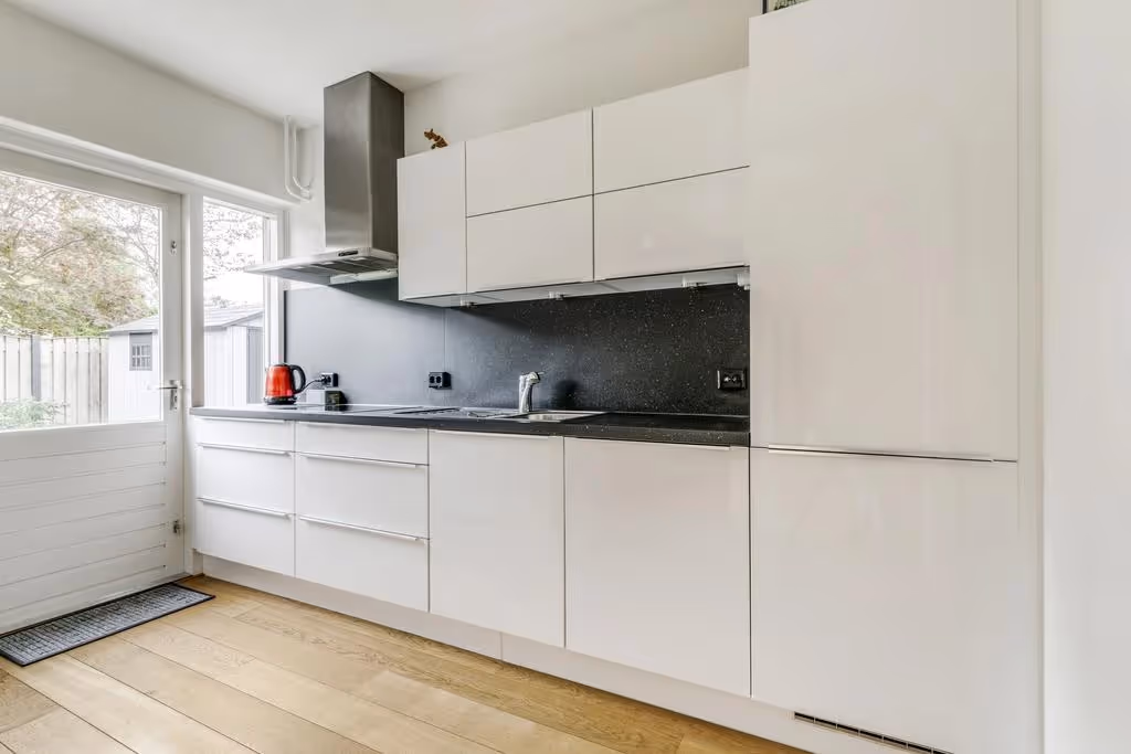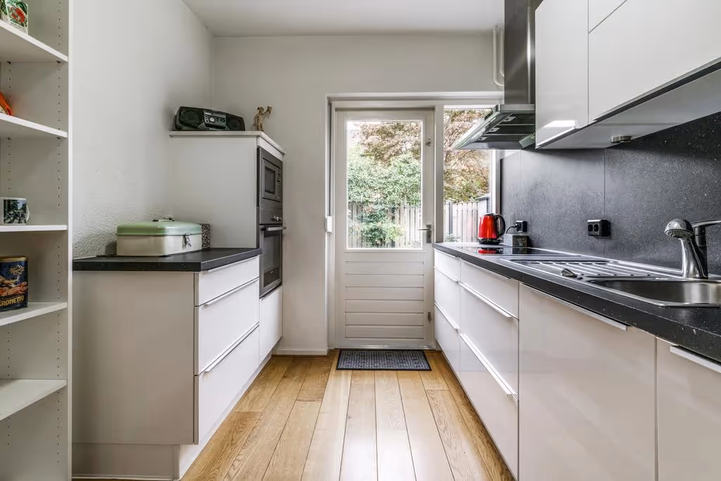 Via de entreehal, waar tevens het gastentoilet en de meterkast zijn gelegen, kom je in de woonkamer. Deze 11 meter diepe woonkamer is lekker licht en ruim van opzet met openslaande tuindeuren. Verder ligt in de woonkamer een massief eiken parketvloer en heeft de kamer een houtkachel. Aan de achterzijde ligt de half open keuken, met modern keukenblok, welke van alle gemakken is voorzien. De keuken is uitgevoerd met de volgende inbouwapparatuur: 4-pits inductie kookplaat, afzuigkap, vaatwasser, koelkast, vriezer, magnetron en oven. Vanuit de keuken is tevens een trapkast toegankelijk, met behoorlijke wat opbergruimte en de aansluitpunten voor de wasmachine en droger.