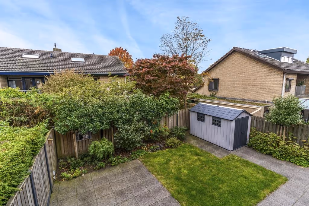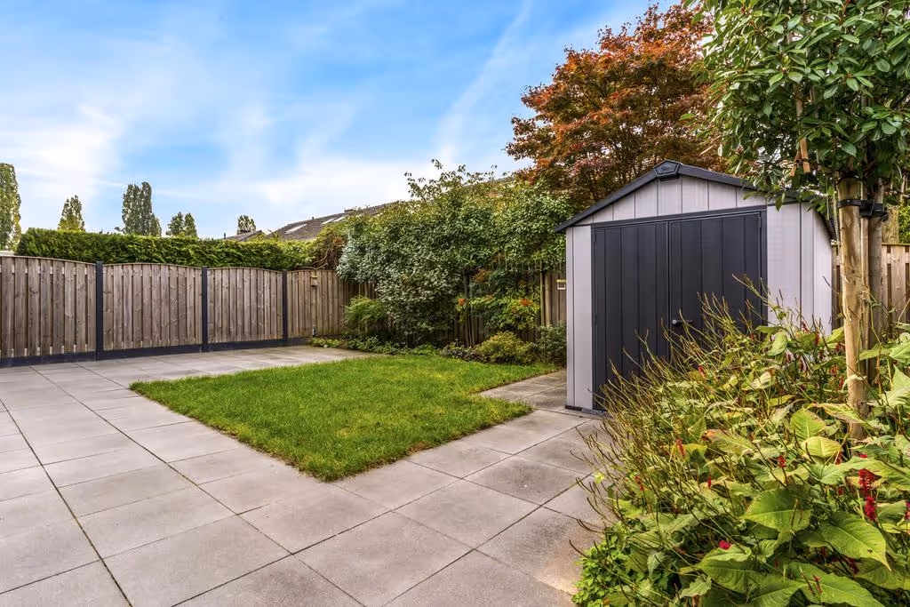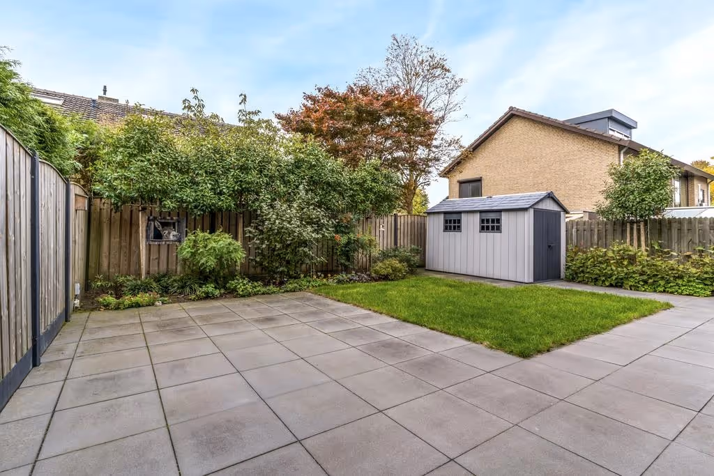 De achtertuin van dit fijne woonhuis is netjes aangelegd en onderhoudsvriendelijk. Naast de aangebouwd stenen garage ligt een eigen achterom. De tuin ligt op het Zuiden, waardoor deze heerlijk zonnig is. Verder zijn een ruim terras en gazon aanwezig. Een ruim, weersbestendig tuinhuis zorgt voor extra opbergruimte. Ideaal voor bv. tuinspullen, fietsen, etc. Deze garage heeft een elektrische sectionaalpoort, verwarming, water en boiler voor de keuken.