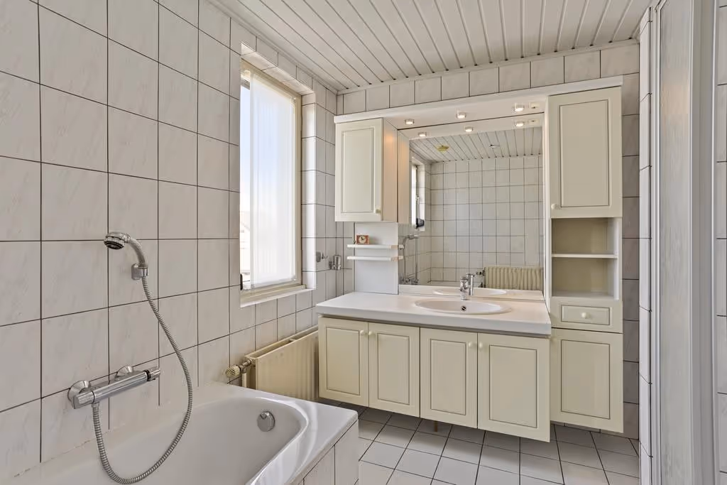 Via de overloop zijn 3 nette slaapkamers en de badkamer toegankelijk. Deze badkamer beschikt over een wastafelmeubel, een douchecabine, een ligbad en een 2e toilet. Alle 3 de slaapkamers hebben een keurig niveau van afwerking met o.a. laminaatvloeren. De hoofdslaapkamer heeft een airco en de kozijnen op de kamers hebben enkele beglazing en rolluiken.