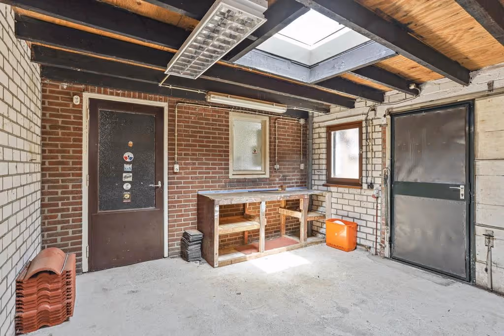 Entree in de ontvangsthal, met meterkast en toegang naar woonkamer en het toilet. Deze woonkamer heeft een mooie lichtinval door de grote raampartijen en een nette laminaatvloer. Ook hangt in de woonkamer een airco. Vanuit de woonkamer bereik je de keuken, met de volgende inbouwapparatuur: 4-pits gasfornuis, afzuigkap en koelkast. Achter de keuken ligt een 2e hal, met aansluitpunten voor het witgoed en toegang naar de achtertuin. Na deze 2e hal, kom je in de bijkeuken. Hier hangt de CV combiketel (Vaillant, huur, 2015) Tenslotte geeft deze bijkeuken op zijn beurt weer toegang tot de inpandige berging en een grote schuur / garage. Deze ruimte is ideaal om als hobby- of klusruimte te gebruiken, of zelfs om te verbouwen tot extra slaap- of speelkamer. Alles is mogelijk, jij bepaalt.