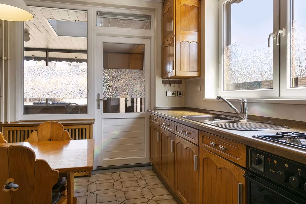 Entree in de ontvangsthal met toilet met fonteintje, meterkast en toegang naar de woonkamer en keuken. Deze woonkamer heeft een keurig niveau van afwerking en een mooie lichtinval via het grote kozijn aan de voorzijde. De separate keuken bevat een eenvoudig keukenblok en zowel vanuit deze keuken, als vanuit de woonkamer, is de serre toegankelijk. De serre bevat veel extra ruimte en kan prima ingericht worden als eetkamer of zelfs als leefkeuken.