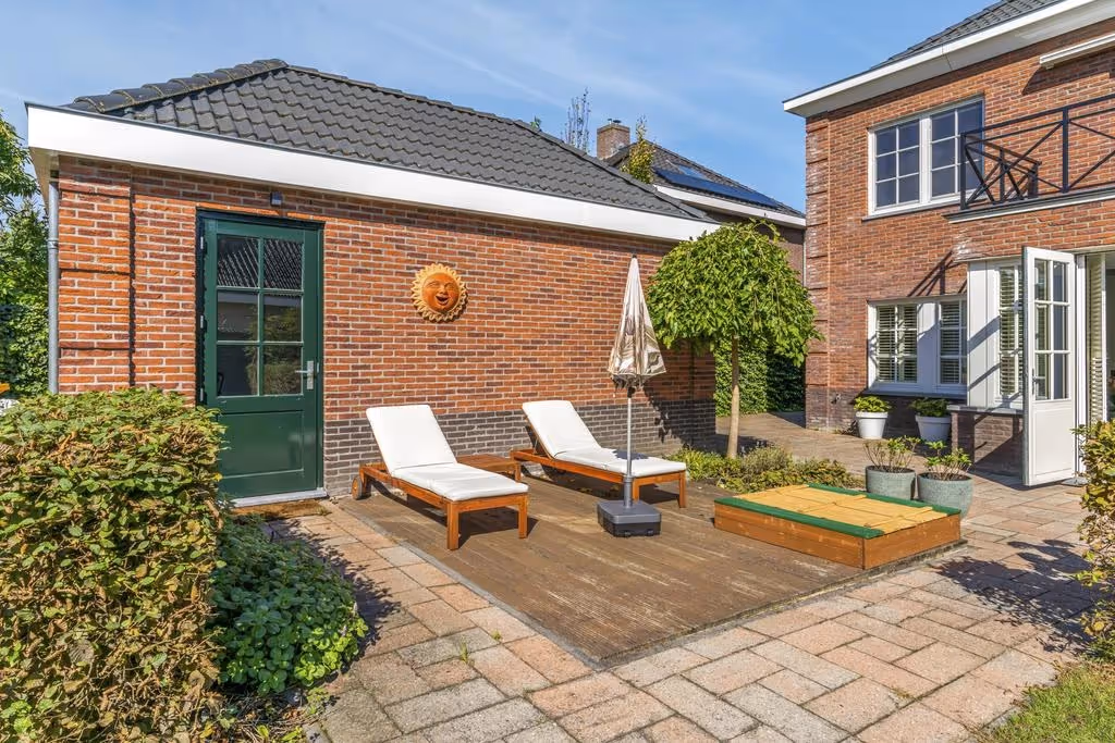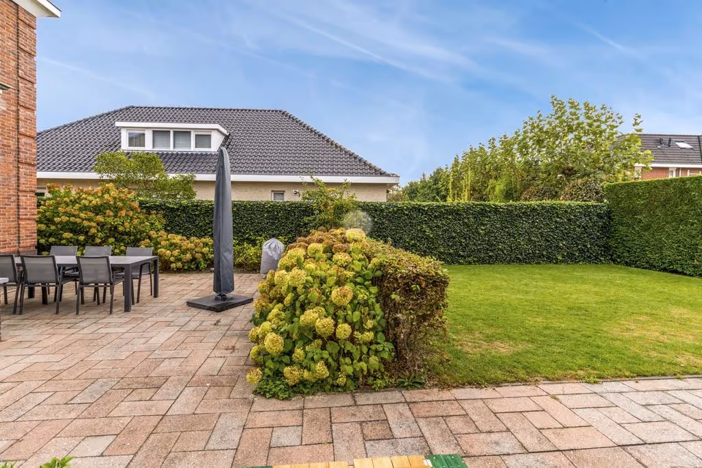 De tuin is een oase van rust en met een mooie balans tussen beplanting, terras en gazon, is het hier heerlijk vertoeven. De tuin is gesitueerd op het Zuiden en heeft aan 2 zijden een achterom. In de tuin bevindt zich een vrijstaande garage, met een tegelvloer, extra keukenblok en een dubbele, houten toegangsdeur. Tenslotte beschikt het perceel over een riante oprit, geschikt voor meerdere voertuigen.