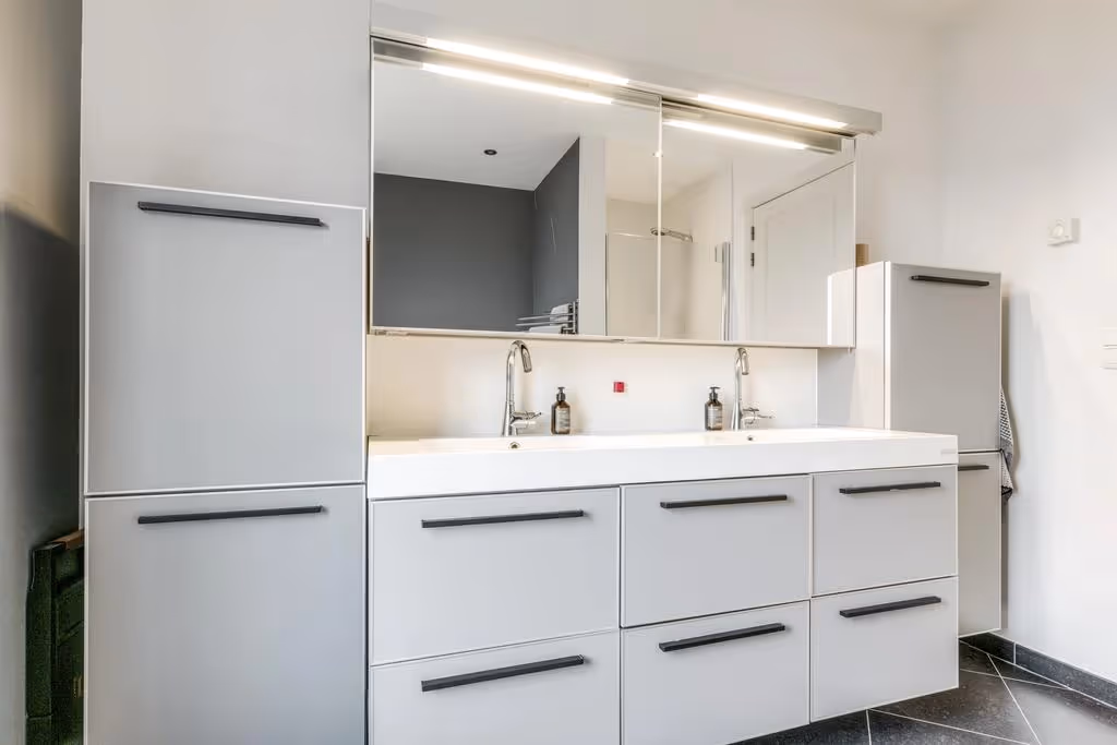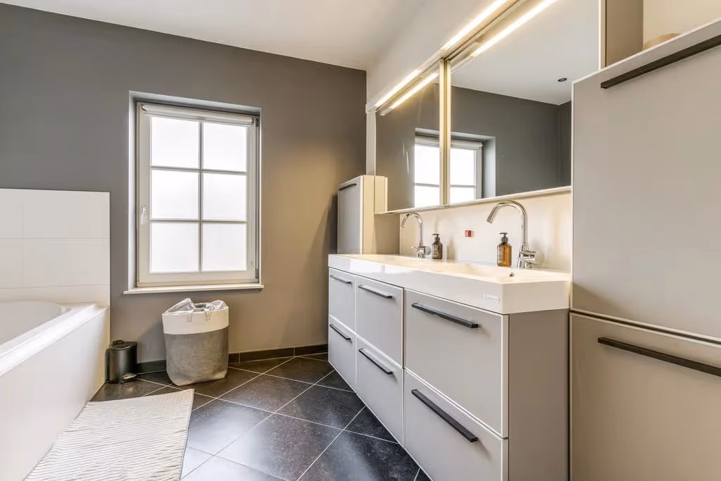 Via de overloop / vide op de 1e verdieping zijn de 4 slaapkamers, een riante walk-in closet, een separaat toilet en de badkamer bereikbaar. De hoofdslaapkamer, gelegen aan de achterzijde van het woonhuis is zeer royaal en biedt toegang tot een balkon. De overige 3 slaapkamers zijn eveneens ruim van opzet en alle slaapkamers hebben een keurig niveau van afwerking, met o.a. PVC vloeren. De moderne badkamer is van alle gemakken voorzien, met een ligbad, een douchecabine en een wastafelmeubel met dubbele wastafel.
