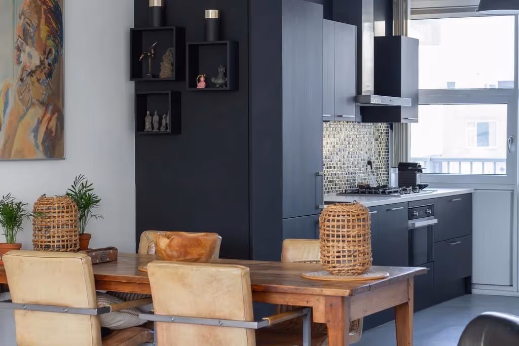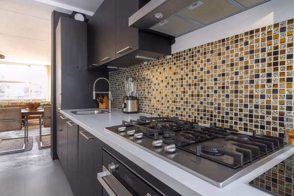 Verder heeft het appartement een moderne, stijlvolle keuken, met als inbouwapparatuur een 5-pits gasfornuis, afzuigkap, koelkast met vriesvak, combi oven en vaatwasser.