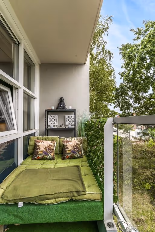 Vanuit de woonkamer is het balkon te bereiken. Deze fijne buitenruimte kijkt mooi uit over de wijk en het nabijgelegen groen. De oppervlakte bedraagt maar liefst circa 10 m², dus je hebt plek voor een loungehoek en een eettafeltje.