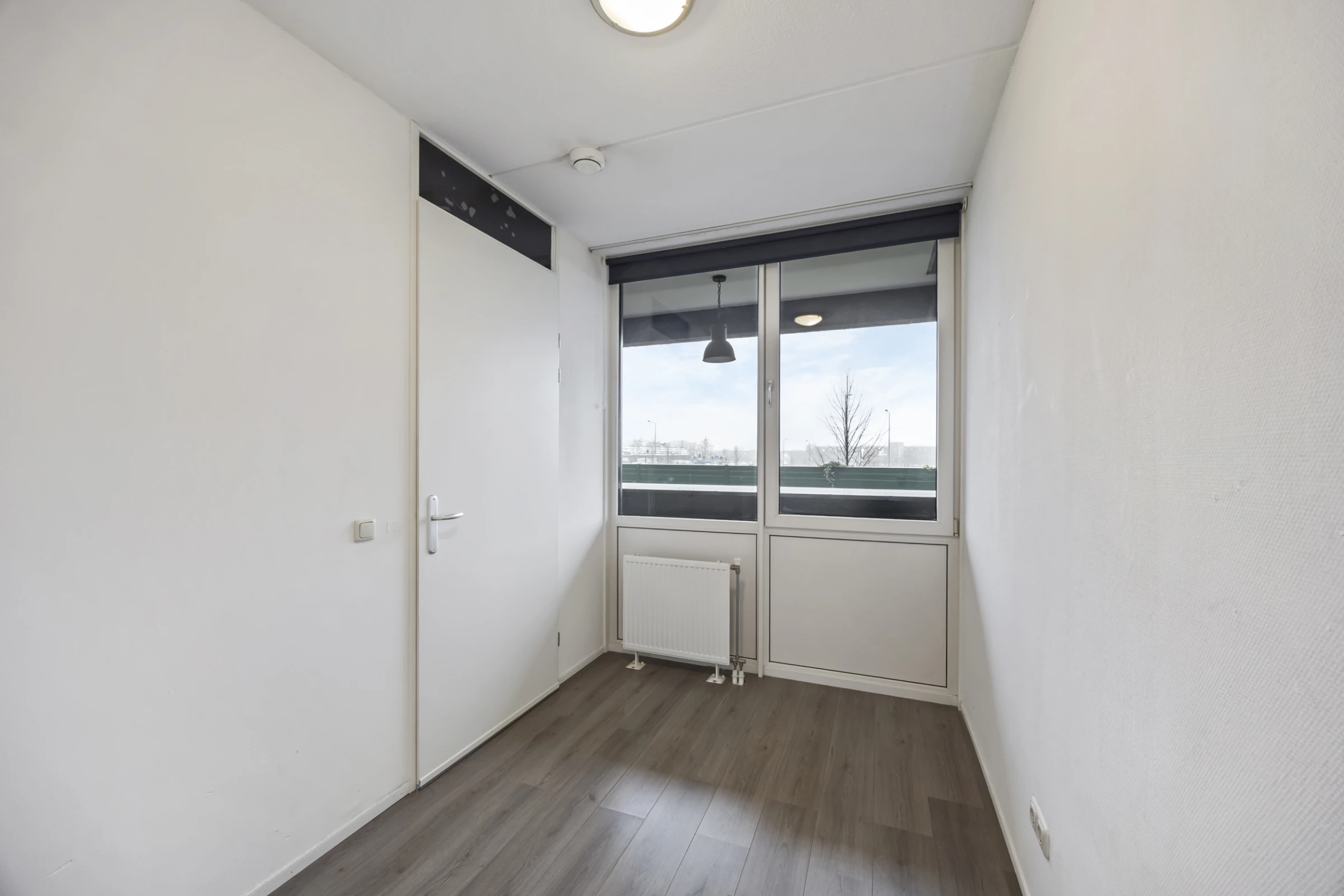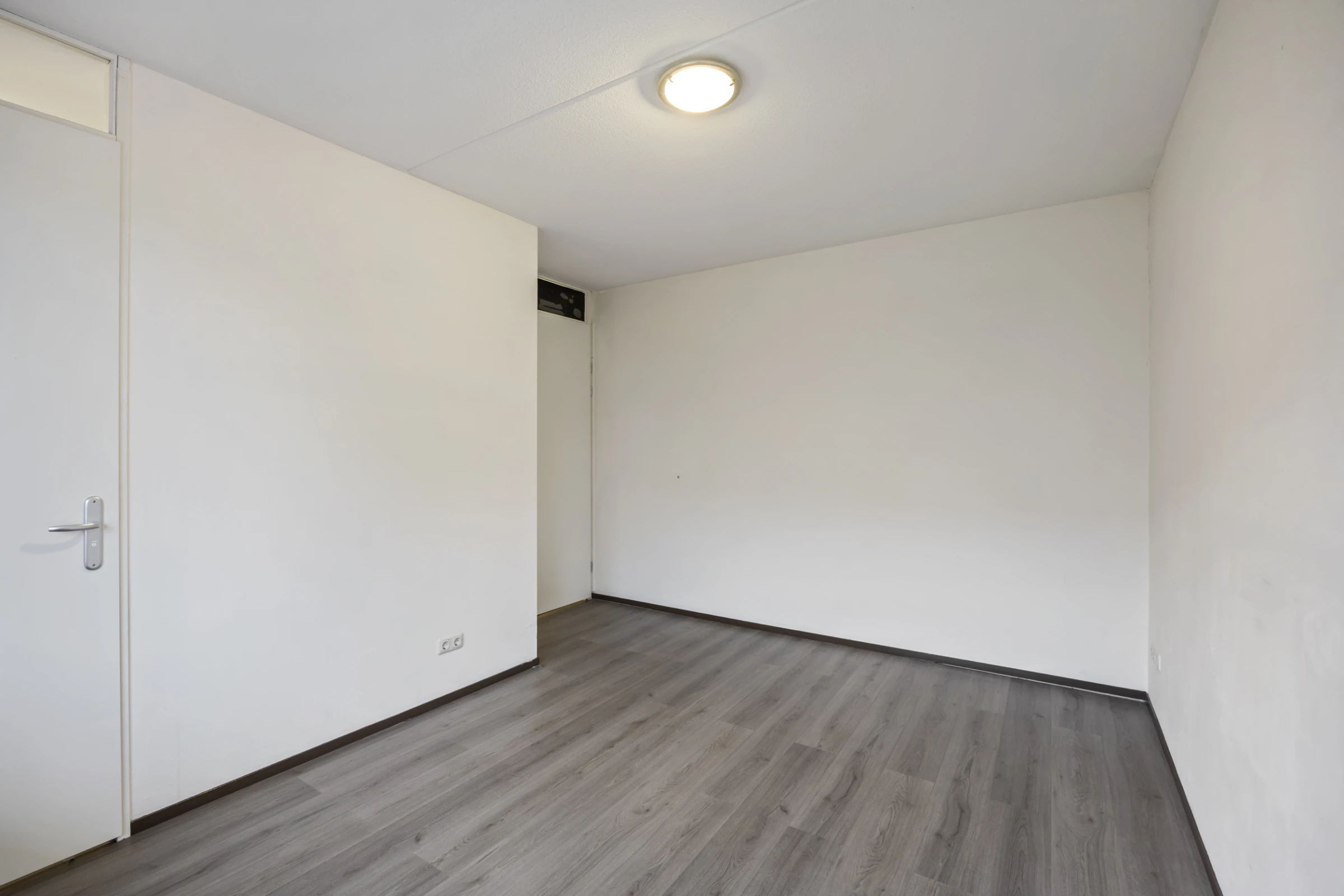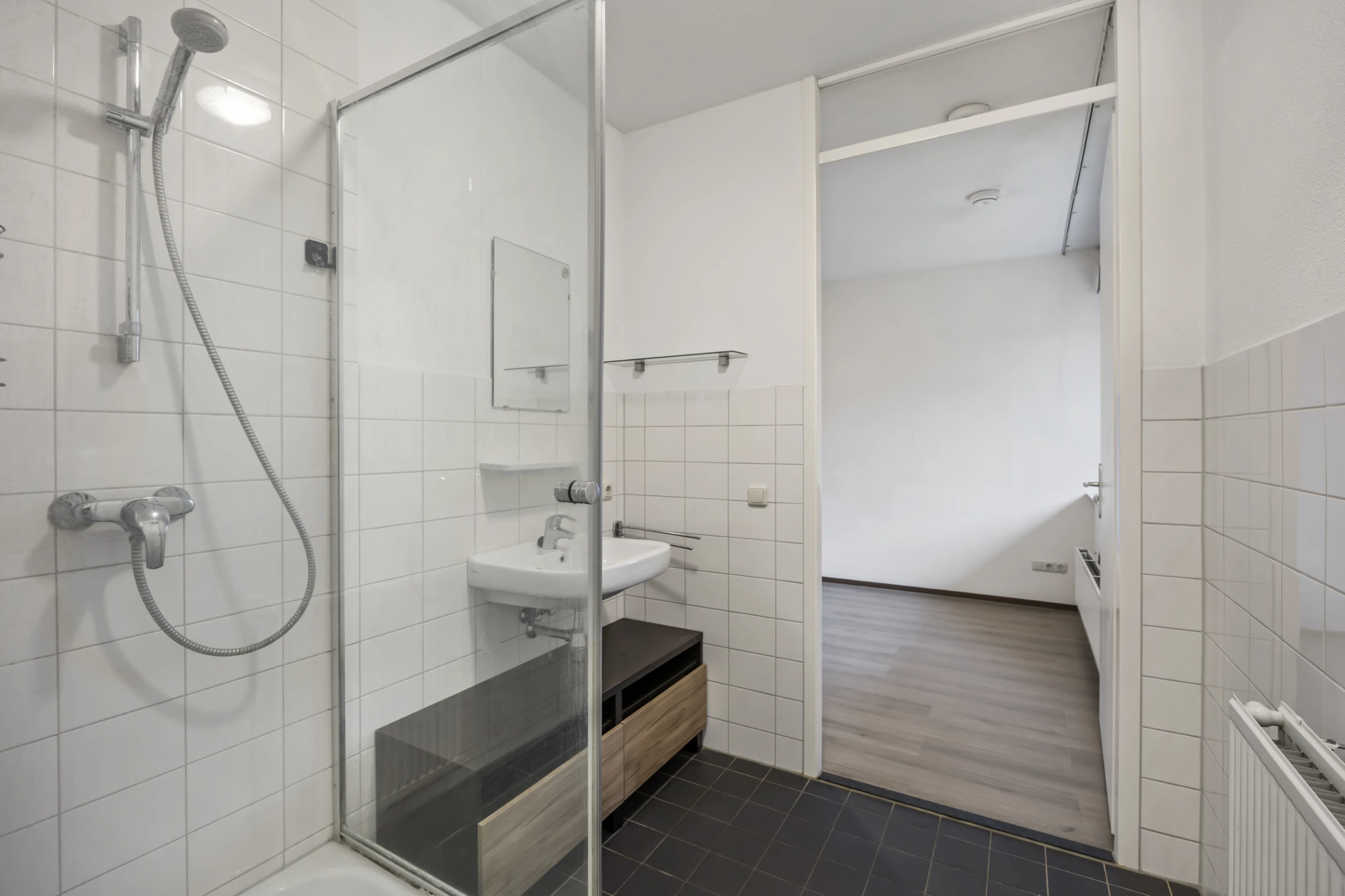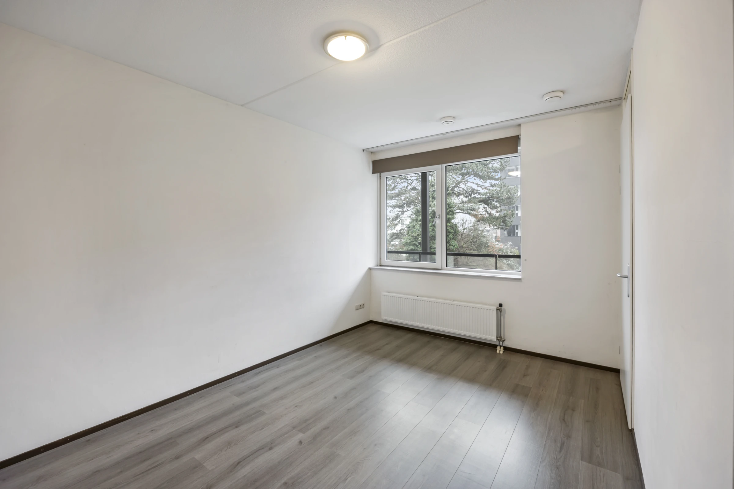 Ook is vanuit de woonkamer de 2e slaapkamer te bereiken. Deze heeft eveneens een laminaatvloer en keurig niveau van afwerking. Het raam kijkt uit op de loggia. Vanuit de hal van dit appartement zijn de hoofdslaapkamer en de badkamer toegankelijk. Deze slaapkamer heeft hetzelfde niveau van afwerking als het gehele appartement, met wederom een nette wandafwerking en laminaatvloer. De badkamer tenslotte is voorzien van een wastafel en een douchecabine en is keurig onderhouden.