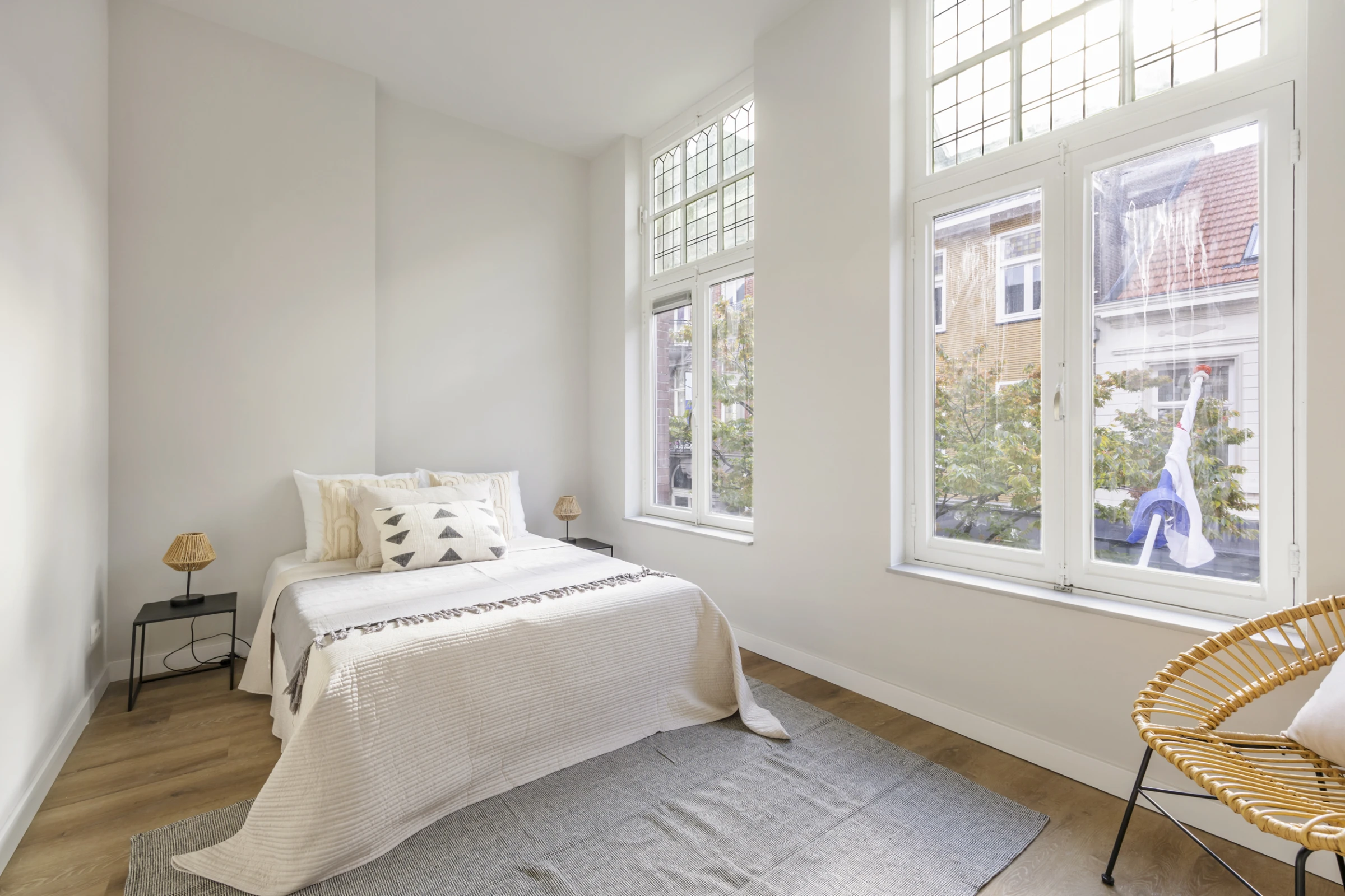 Dit appartement beschikt vervolgens over 2 nette slaapkamers. Ook hier fraaie, hoge plafons, nette wanden en een nieuwe PVC vloer, net als in de woonkamer en keuken. De hoofdslaapkamer ligt aan de voorzijde en de logeerkamer aan de achterzijde van het appartement.
