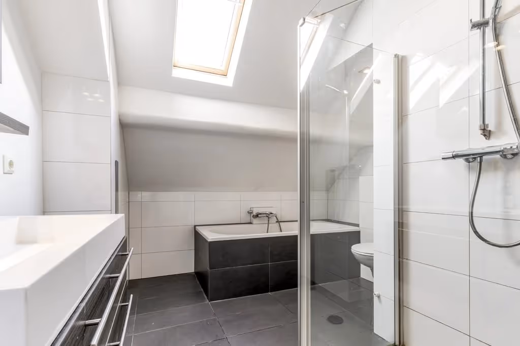 Via de overloop op de 1e verdieping zijn 4 nette (slaap)kamers en de moderne badkamer te bereiken. De badkamer bevat een 2e toilet, wastafelmeubel, een ligbad en inloopdouche. Alle slaapkamers hebben laminaatvloeren en houten kozijnen, met dubbele beglazing en rolluiken en slaapkamer aan de voorzijde heeft ook een dakkapel.