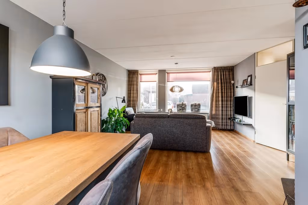 Entree in de hal met toilet, moderne meterkast en toegang tot de woonkamer. Deze sfeervolle woonkamer heeft een keurig niveau van afwerking, met onder ander een mooie vloer en strak gestucte wanden. Tevens is in de woonkamer een trapkast aanwezig, met extra bergruimte. De half open keuken ligt aan de achterzijde van de woning en heeft een keukenblok in hoekopstelling. Tenslotte beschikt de keuken over de volgende inbouwapparatuur: 4-pits gasfornuis, RVS wasemkap, koelkast, combi oven en vaatwasser.