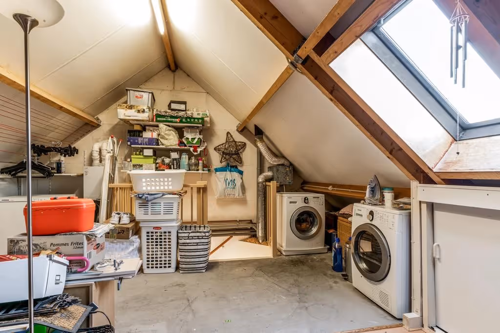 Via een vaste trap is de zolderverdieping te bereiken. Hier is een riante extra kamer, welke nu als was- en bergruimte in gebruik is. Uiteraard kun je deze zolder ook prima als 4e slaapkamer gebruiken, want er is al een dakraam met een mooie lichtinval. Tenslotte zijn op deze verdieping de aansluitpunten voor de wasmachine aanwezig, een mechanische ventilatie en de CV combiketel (Vaillant, eigendom, 2018).