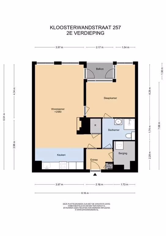 Het appartement zelf ligt op de 2e verdieping. Je komt binnen in de hal (met meterkast) en die geeft toegang tot alle kamers.