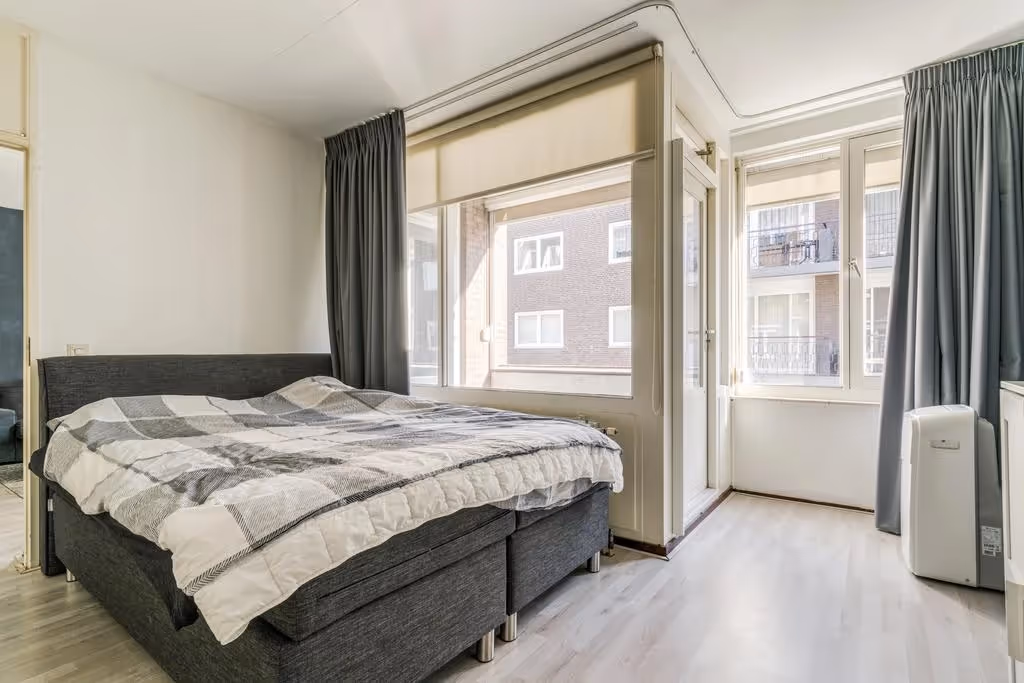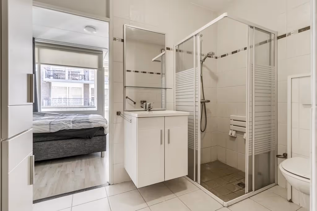 De slaapkamer van dit appartement grenst eveneens aan de loggia en is ook mooi licht. Zowel vanuit de slaapkamer en de hal, is de badkamer te bereiken. Deze badkamer heeft een inloopdouche, wastafelmeubel en toilet. Tenslotte ligt in het appartement nog een berging, met aansluitpunten voor het witgoed en de boiler voor het heet water.
