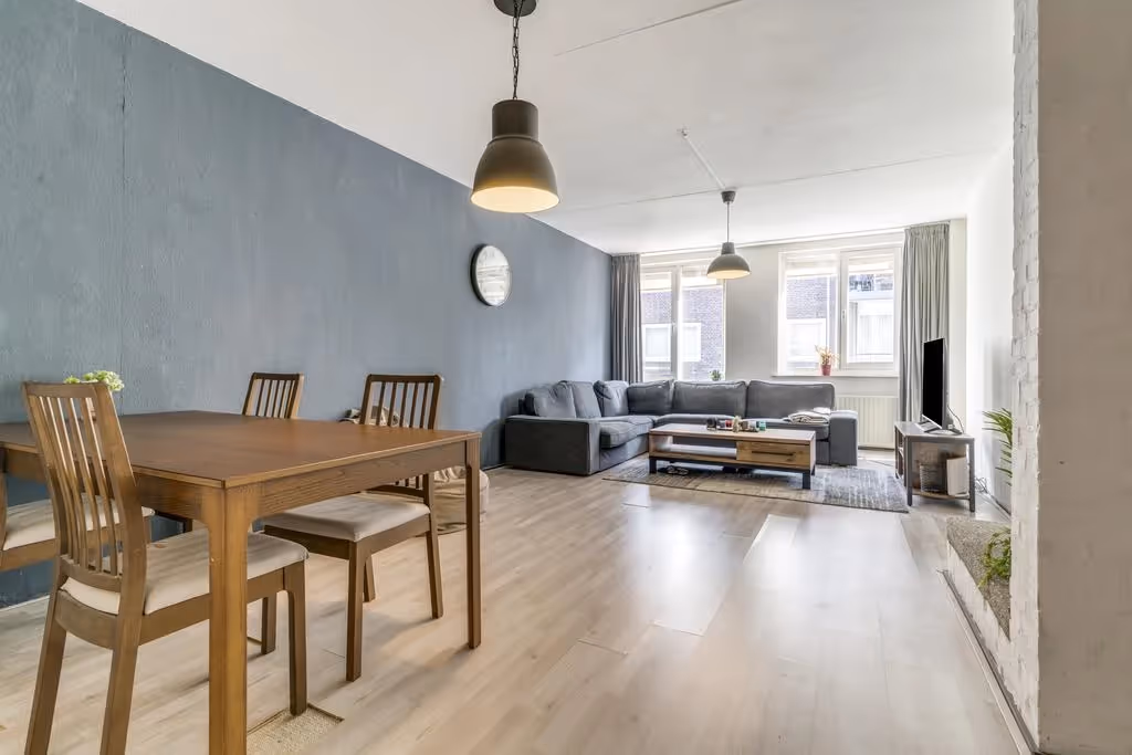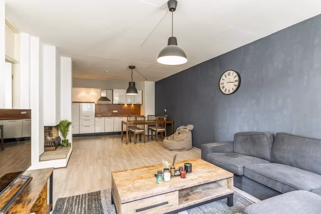 De woonkamer is verdeeld in een zit- en eethoek en door het feit dat het appartement grote kozijnen heeft, heeft het lekker veel lichtinval.