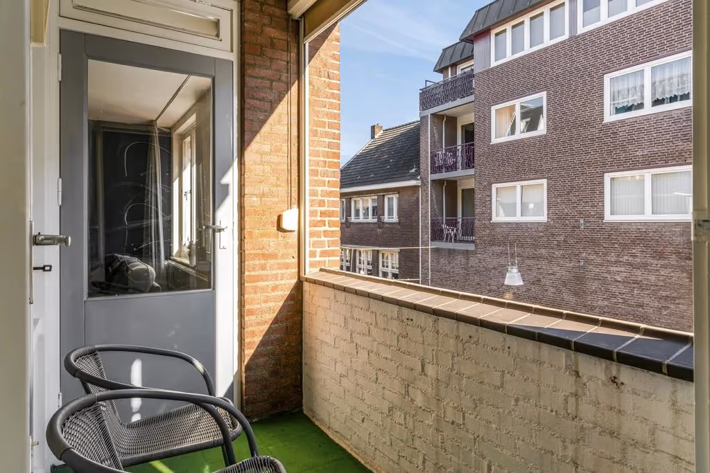 Vanuit de woonkamer is de loggia te bereiken. Deze fijne buitenruimte ligt op het Zuiden en heeft zicht op het Kloosterwandplein.