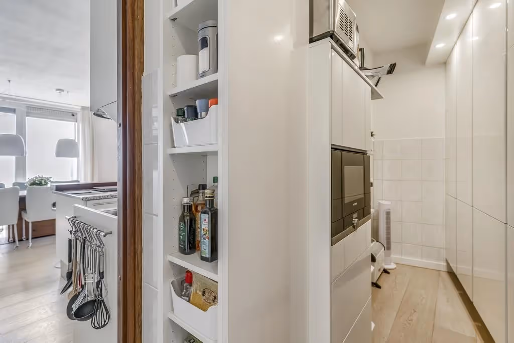 Het appartement is gelegen op de 9e verdieping en beschikt over vloerverwarming. Entree in de hal, met toilet met fonteintje en toegang tot de diverse vertrekken. De woonkamer is heerlijk licht en voorzien van een stijlvolle lamel-parket vloer. De keuken staat in open verbinding met de woonkamer en heeft een kookeiland, met barretje en verder alle comfort die u mag verwachten; een inductiekookplaat, recirculatiekap, koelkast, stoomoven, vaatwasser en inbouw koffiemachine. Vanuit de keuken is voorts een bijkeuken (met magnetron) toegankelijk, waar een riante kastenwand op maat is gerealiseerd met veel extra bergruimte.