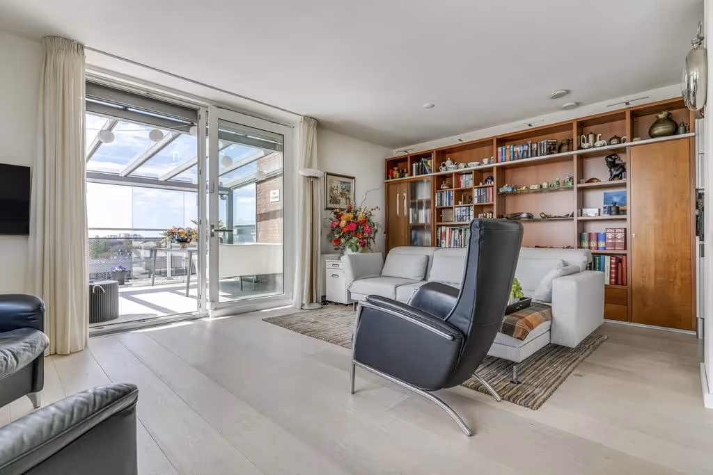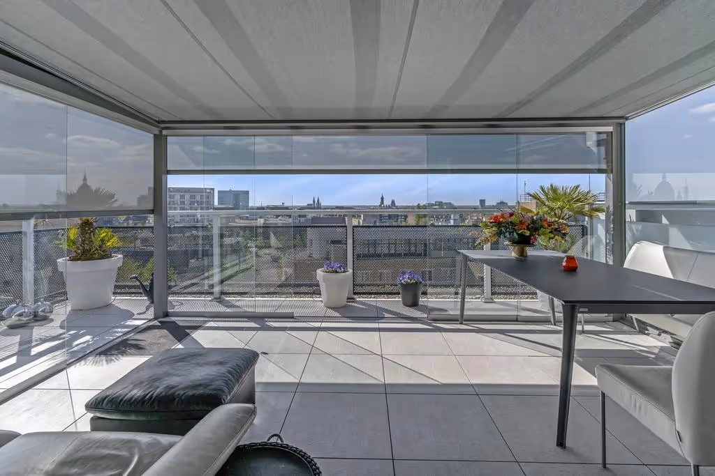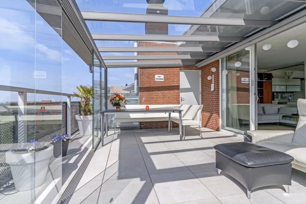 Vanuit de woonkamer zijn middels 2 schuifpuien de hoogwaardige wintertuin en het dakterras te bereiken. Deze luxe ruimte biedt een schitterend uitzicht over Roermond en door de glazen schuifwanden aan 2 zijden, kun je hier het grootste gedeelte van het jaar, beschermd tegen regen en wind, genieten van het uitzicht. In de zomer zit je beschut door het zonnedoek en de screens, in het voor- en najaar zit je behaaglijk warm, door de afsluitbare glazen puien. Het gehele dakterras is voorzien van een fraaie keramische tegelvloer en aan de Zuidkant loopt dit door tot aan de slaapkamers, met hier een fraai uitzicht over het tegenover gelegen park en de bossen van natuurgebied de Meinweg. Vanuit de serre / wintertuin kun je de belangrijkste historische gebouwen van Roermond bewonderen; van de Munsterkerk, tot de Sint Christoffel Kathedraal.