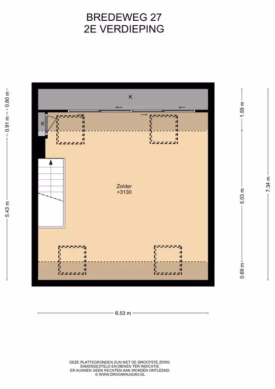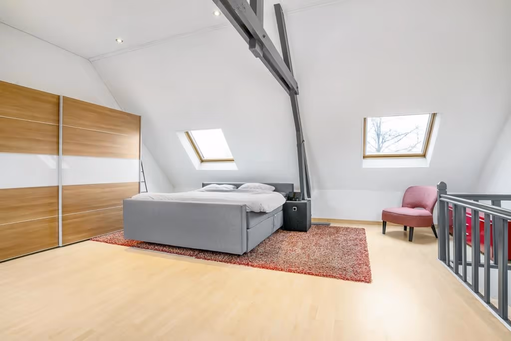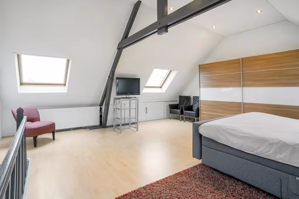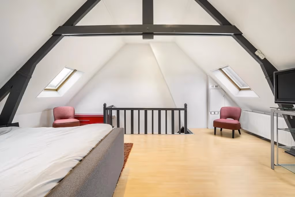 Via een vaste trap is de royale zolderetage te bereiken. Hier bevindt zich momenteel de hoofdslaapkamer. Deze kamer heeft fraaie, houten balken en met maar liefst 4 grote dakramen, altijd een mooie lichtinval. Ook is het dak geïsoleerd.
