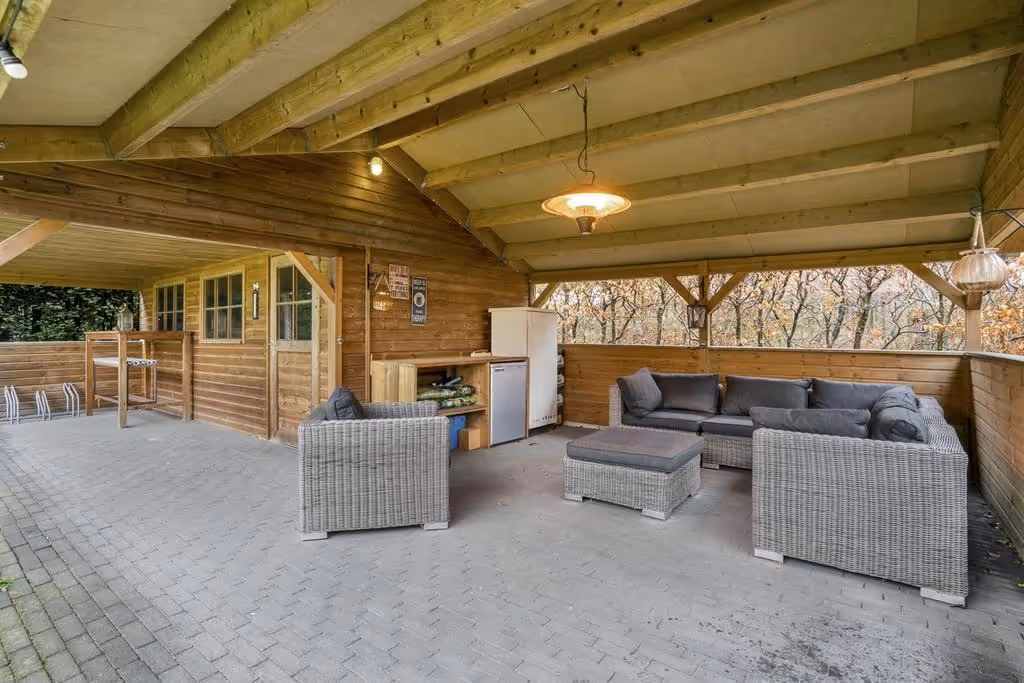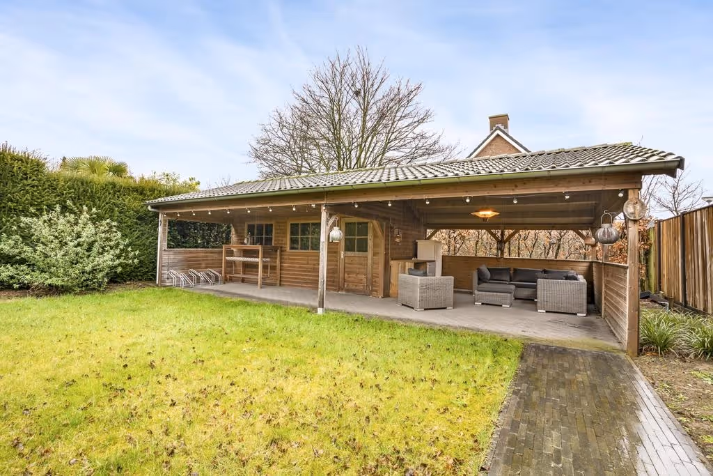 - Riant houten tuinhuis met groot overdekt terras.