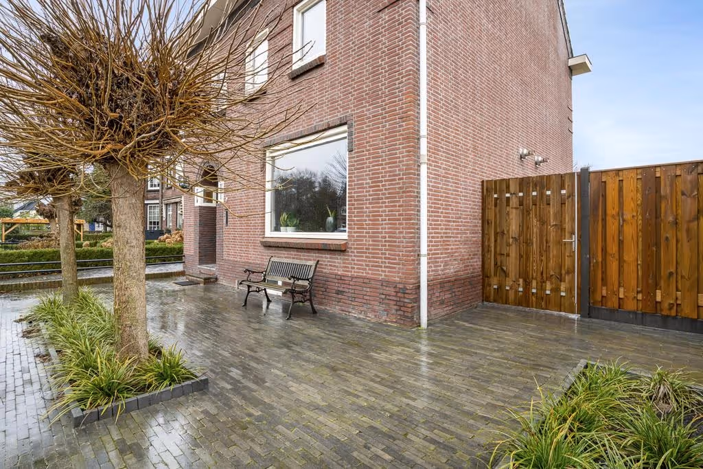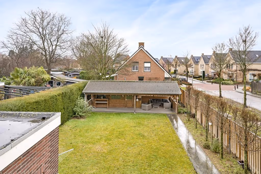 Tenslotte heeft dit sfeervolle jaren ’30 woonhuis nog een heerlijke tuin, waar je kunt genieten van lange avonden, onder andere onder de luxe houten overkapping, achterin de tuin. Deze overkapping is onderdeel van een groot tuinhuis en biedt plaats aan een grote zithoek, een fijne eetplek voor familie en vrienden of een buitenkeuken. Wie droomt daar nou niet van? De tuin is keurig aangelegd met beplanting, een groot gazon en 2 terrassen met sierbestrating. De tuin is gelegen op het Oosten en heeft tenslotte een eigen achterom.