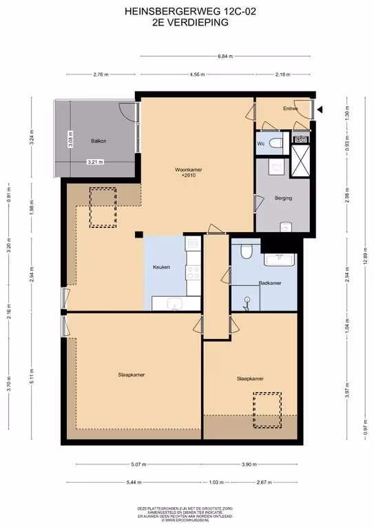 Vervolgens is vanuit de woonkamer de bijkeuken / technische ruimte te bereiken. Hier bevindt zich de opstelplaats van het witgoed, veel extra bergruimte, maar ook de luchtwarmtepomp en de WTW unit (warmte-terugwin unit). Een 2e hal brengt u naar de beide slaapkamers en de moderne badkamer. Deze slaapkamers hebben hetzelfde fraai niveau van afwerking als het gehele appartement, met wederom de pvc-vloer in visgraat motief. De badkamer tenslotte is voorzien van een royaal wastafelmeubel, een 2e toilet, een inloopdouche en een (extra) elektrische designradiator.