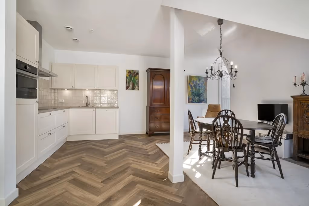 Het appartement is gelegen op de 2e verdieping. Entree in de hal, met meterkast en toegang tot moderne toilet met fonteintje. De woonkamer is heerlijk licht en voorzien van een stijlvolle pvc-vloer. De keuken staat in open verbinding met de woonkamer en heeft een hoekopstelling met alle comfort die u mag verwachten; een inductiekookplaat, RVS afzuigkap, koelkast, combi-oven en vaatwasser. In de keuken is plaats voor een eettafel.