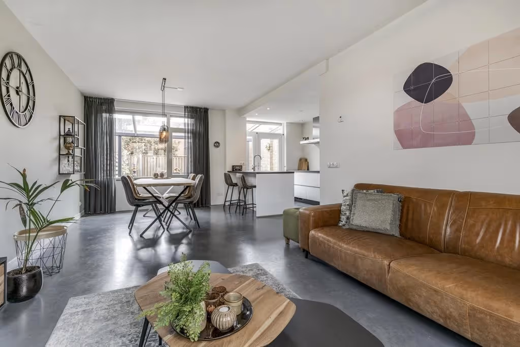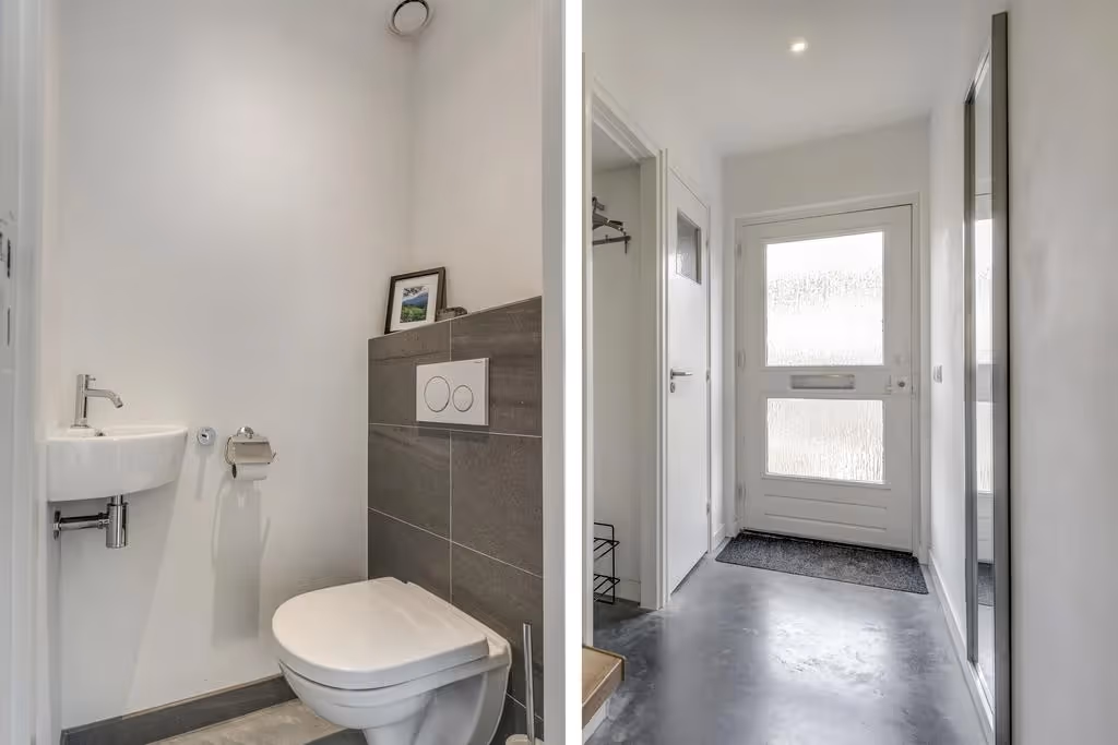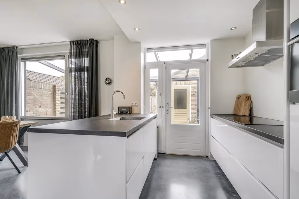 Entree in de hal met toilet, meterkast en toegang tot de woonkamer / keuken. In de woonkamer heb je een mooie lichtinval door de riante kozijnen. De woonkamer heeft verder een uitstekend niveau van afwerking en een strakke gietvloer. De half open keuken is geplaatst omstreeks 2019 en heeft een mooi eiland en alle gangbare inbouwapparatuur, namelijk: een inductie kookplaat, RVS afzuigkap, koelkast, combi oven en vaatwasser. Tenslotte heeft de begane grond vloerverwarming.