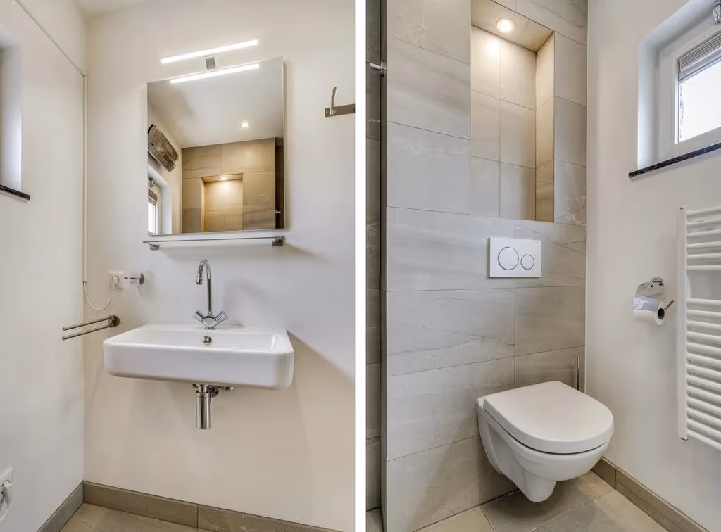 Via de overloop op de 1e verdieping zijn 3 nette (slaap)kamers en de moderne badkamer te bereiken. De badkamer bevat een 2e toilet, wastafel, inloopdouche en een elektrische designradiator. Alle slaapkamers hebben moderne laminaatvloeren en kunststof kozijnen, met HR++ beglazing en 2 slaapkamers hebben handige muurkasten. Tenslotte is op 1 van de slaapkamers een aansluitpunt voor de wasmachine aanwezig. Mocht je het handiger vinden, dan is deze ook op zolder te realiseren.