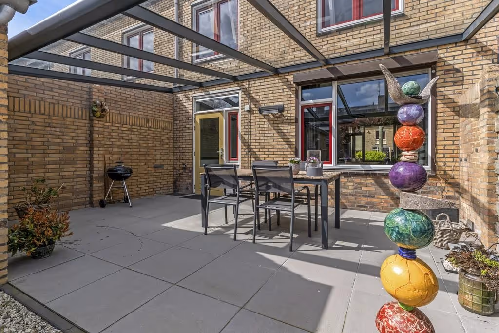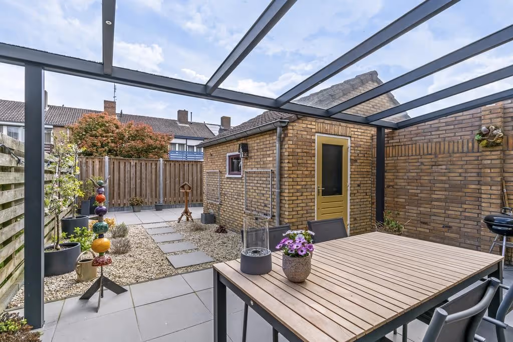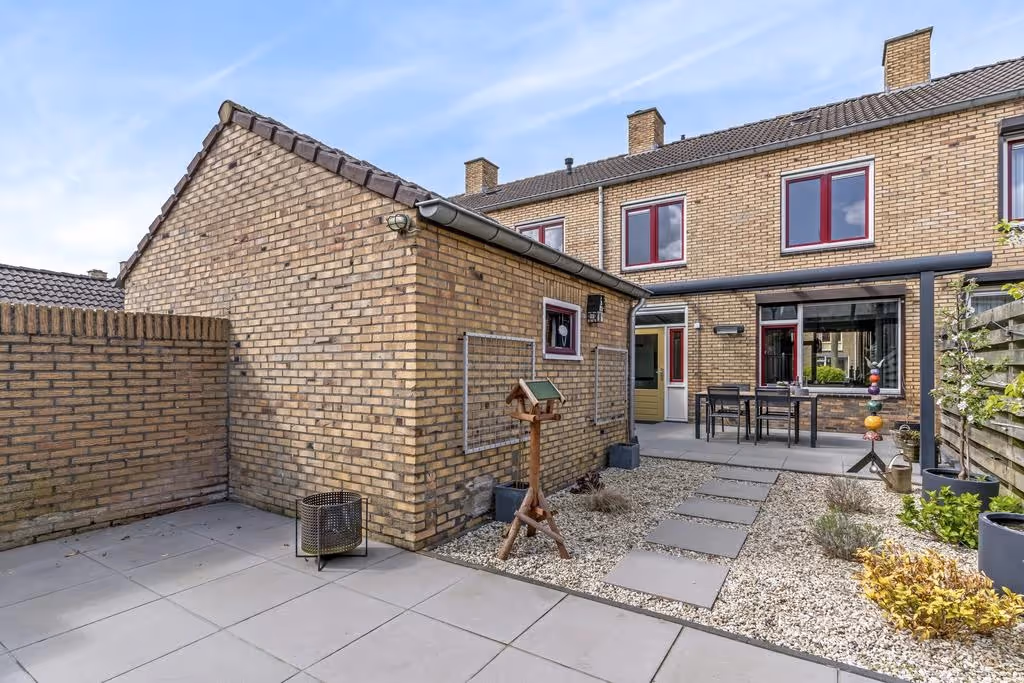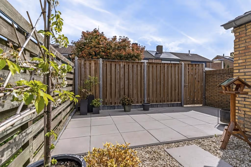 Deze fijne gezinswoning heeft ook nog eens een gezellige achtertuin, met veel privacy. Deze is keurig netjes aangelegd met een overdekt terras en sierbestrating. De tuin is helemaal omheind, heeft een eigen achterom middels een paadje aan de achterzijde en een stenen tuinberging.