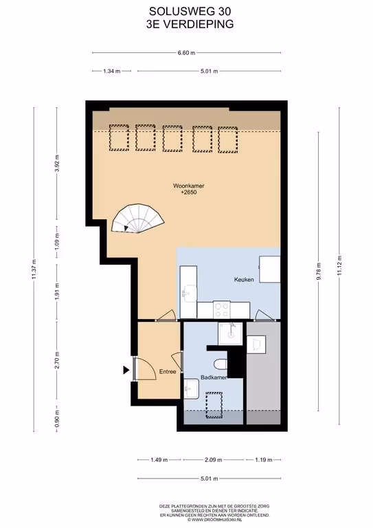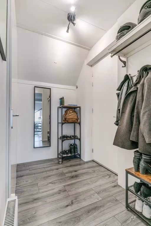 De entree van dit fijne appartement ligt op de 3e verdieping. Je komt binnen in de hal (met meterkast) en die geeft toegang tot de woonkamer met open keuken en de badkamer.