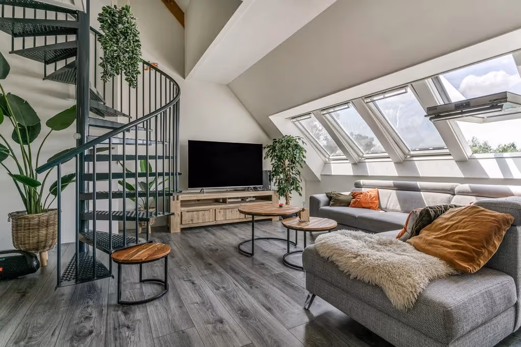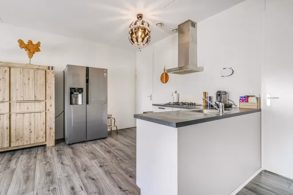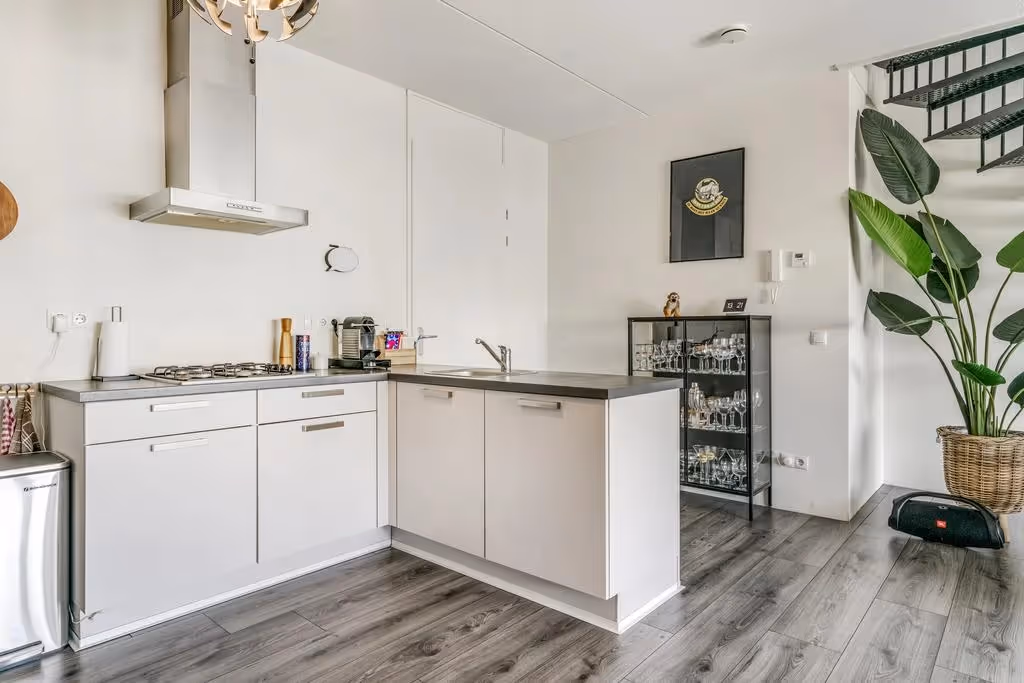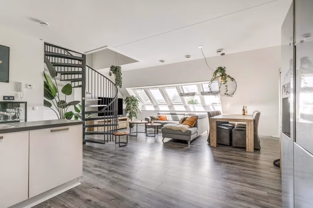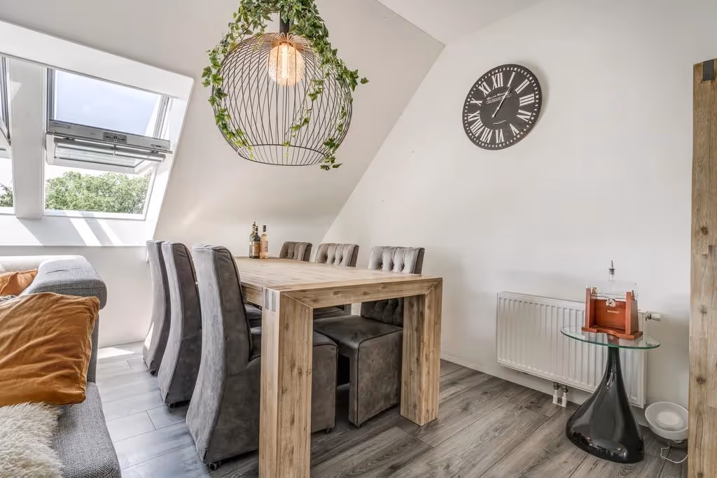 Deze lichte woonkamer is verdeeld in een zit- en eethoek en door het feit dat het appartement grote dakramen heeft, heeft het lekker veel lichtinval. De open keuken heeft een keukenblok in hoekopstelling en de volgende inbouwapparatuur: een 4-pits gasfornuis en een afzuigkap. Het hele appartement heeft een keurig niveau van afwerking, met onder andere nette laminaatvloeren.