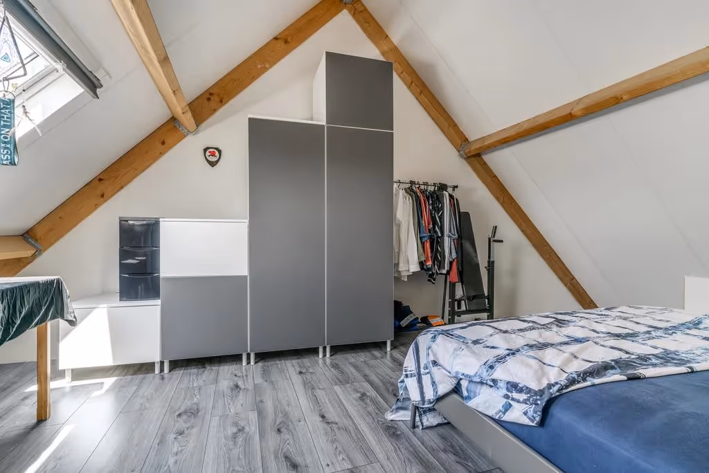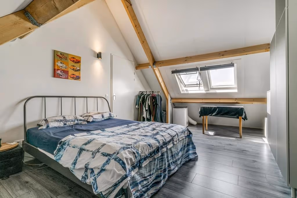 Via de trap in de woonkamer is de verdieping van dit appartement te bereiken. Hier liggen een riante slaapkamer en een grote, extra berging / technische ruimte. De slaapkamer is ook netjes en heeft dezelfde mooie dakramen, als de woonkamer. In de extra berging op deze verdieping, heb je ook lekker veel plek voor je spullen en hier zijn de CV combiketel (Vaillant, eigendom, bouwjaar 2008) en WTW unit (warmte-terug-win) geplaatst.