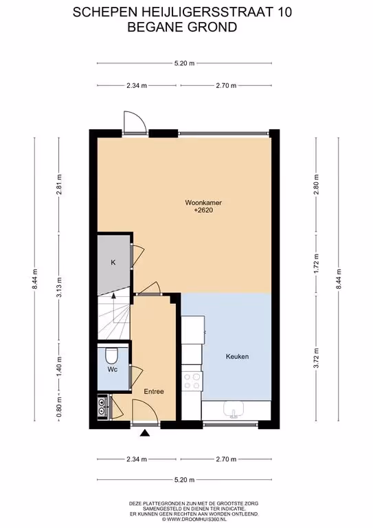 Entree in de ontvangsthal, met toegang naar de woonkamer, moderne meterkast en toilet met fonteintje. De woonkamer is licht, open en is gelegen aan de achterzijde van het huis. Ook is hier een trapkast gelegen. De half open keuken ligt aan de voorzijde en bevat een net keukenblok in hoekopstelling, met de volgende inbouwapparatuur: een 4-pits gasfornuis, RVS wasemkap en vaatwasser. De hele begane grond heeft een nette laminaatvloer en is voorzien van comfortabele vloerverwarming.