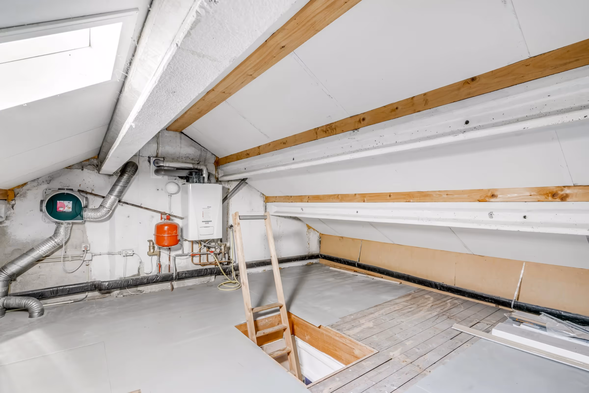 Via een vlizotrap is de zolderverdieping te bereiken. Deze is in het midden op stahoogte en hier bevindt zich momenteel de CV combiketel (AWB, eigendom).