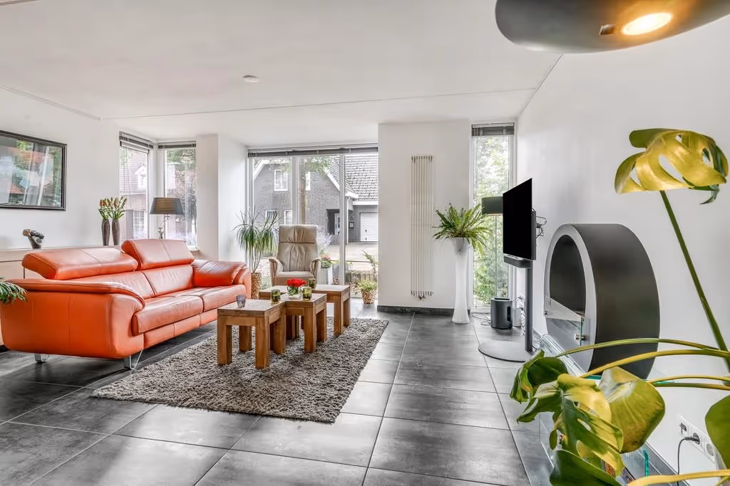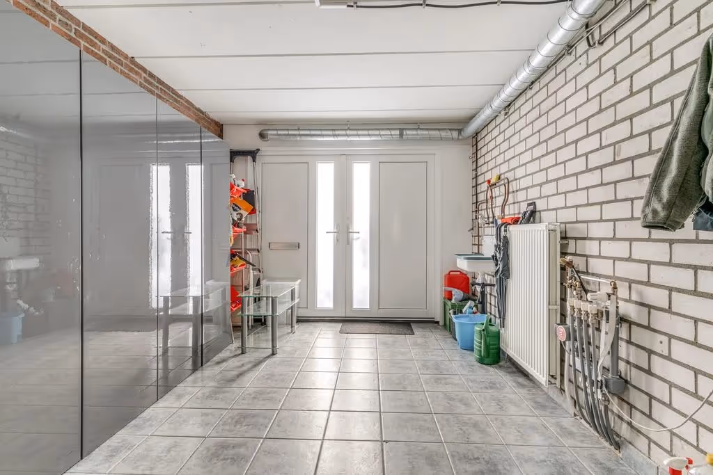 Entree in de hal met toilet met fonteintje, moderne meterkast en toegang tot de woonkamer. In de L-vormige woonkamer heb je een mooie lichtinval door de riante kozijnen en de erker aan de voorzijde. De woonkamer heeft verder een uitstekend niveau van afwerking en staat in verbinding met de half open keuken. Deze luxe keuken is vernieuwd omstreeks 2010 en bevat een modern keukenblok met de volgende inbouwapparatuur: een 5-pits inductiekookplaat, afzuigkap, maar liefst 2 combi ovens, een koelkast en vaatwasser. Verder hebben de woonkamer en keuken vloerverwarming. Vanuit de keuken is de inpandige garage te bereiken. Deze garage bevat de aansluitpunten voor het witgoed, verwarming, een extra spoelbak en dubbele openslaande garagedeuren. Tenslotte ligt over de gehele breedte van het pand, aan de achterzijde van dit fijne woonhuis ook nog een wintertuin / serre. Ook deze heeft een nette tegelvloer en is afsluitbaar met mooie, glazen panelen, waardoor je optimaal van de tuin blijft genieten.