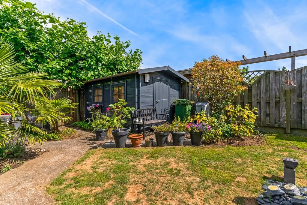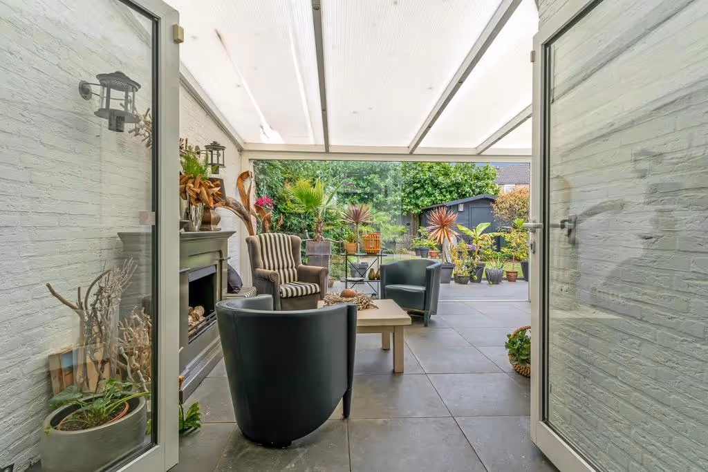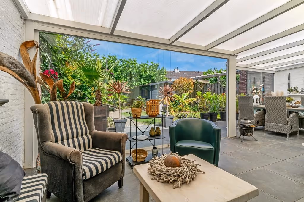 Deze fijne 2-onder-1-kap-woning heeft ook nog eens een fraaie achtertuin, met veel privacy en een eigen achterom. De tuin is gelegen op het Oosten en keurig netjes aangelegd met een gazon en veel groen en beplanting. Tenslotte ligt achterin de tuin een extra terras en een houten tuinhuis.