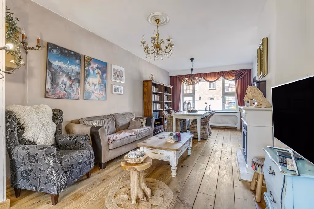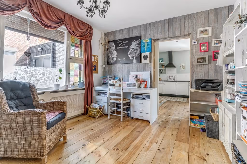 Entree in de ontvangsthal met meterkast en toegang naar de woonkamer en het gastentoilet. De woonkamer is charmant en heeft een massieve parketvloer. Aan de achterzijde is de woning uitgebreid met een uitbouw (omstreeks 2014) en hier is de ruime keuken gelegen. Deze keuken bestaat uit een keukenblok in U-opstelling, met veel werkblad ruimte en de volgende inbouwapparatuur: een 4-pits kookplaat met afzuigkap, koelkast, oven, vaatwasser en ingebouwde koffiemachine. Tevens is in de keuken de aansluiting voor de wasmachine aanwezig en de CV combiketel geplaatst (Intergas, eigendom, 2021). Vanuit de keuken is nog een aparte speel- of werkkamer te bereiken. Ideaal als thuiskantoor of hobbyruimte. Vanuit deze kamer is de kelder toegankelijk.